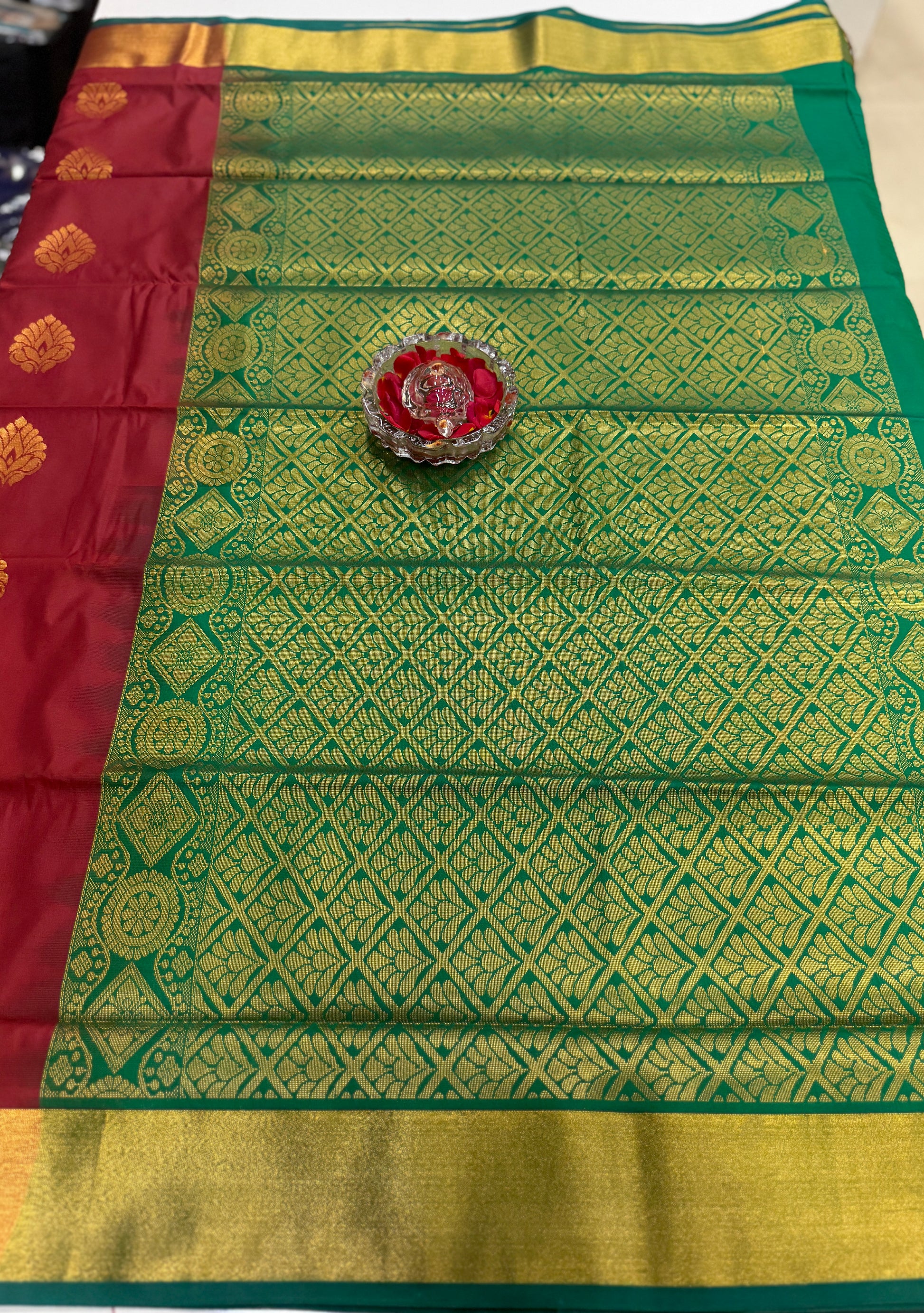 • Work/Design: Intricate zari weaving with traditional motifs inspired by South Indian heritage.