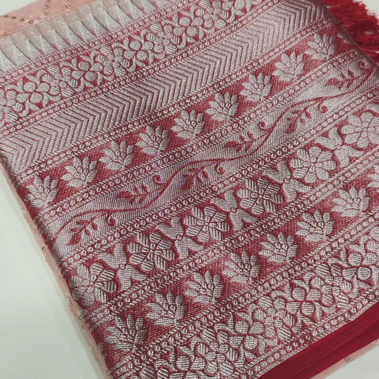 This elegant pure Kanchipuram organza saree is designed for women who appreciate timeless heritage craftsmanship blended with contemporary finesse. The saree features intricate viscose thread concepts woven across a sheer organza base, giving it a graceful drape and refined texture. A highlight of the design is the charming tassel detailing that adds movement and a stylish finishing touch to the pallu. The ensemble is completed with a satin blouse piece that provides a smooth contrast to the organza fabric, ensuring a polished festive or wedding-ready look. Ideal for traditional celebrations, weddings, and festive occasions, this saree brings together artistry, cultural richness, and comfort in one ensemble.