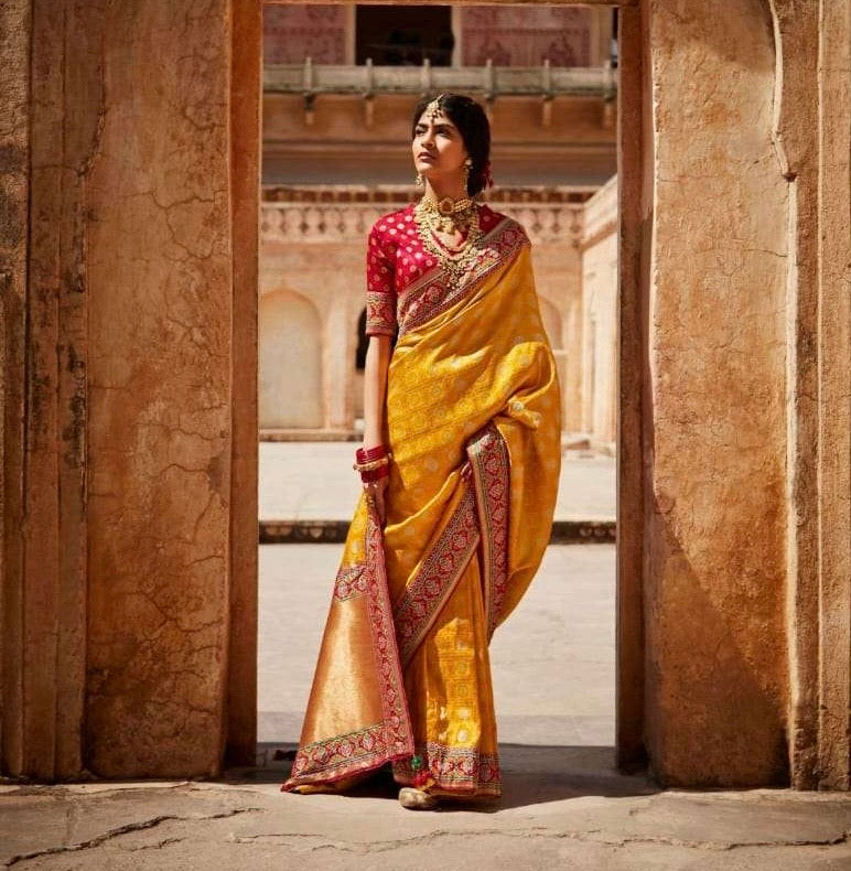 Whether you are styling it with statement jewelry or subtle accessories, these sarees elevate your traditional wear wardrobe and make an impactful impression.