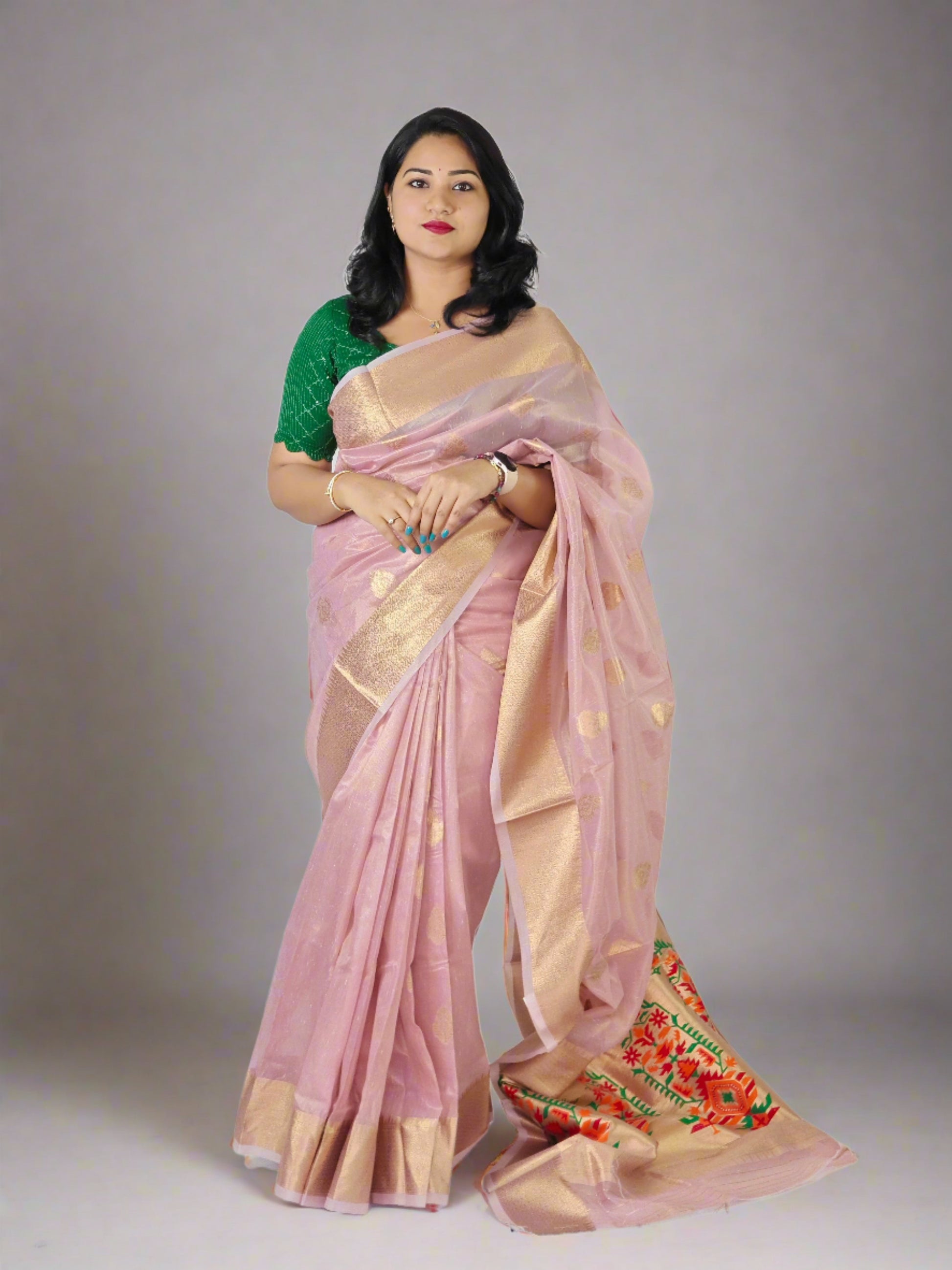 Fabric: Paithani zari tissue handwoven for a shimmering, elegant finish.