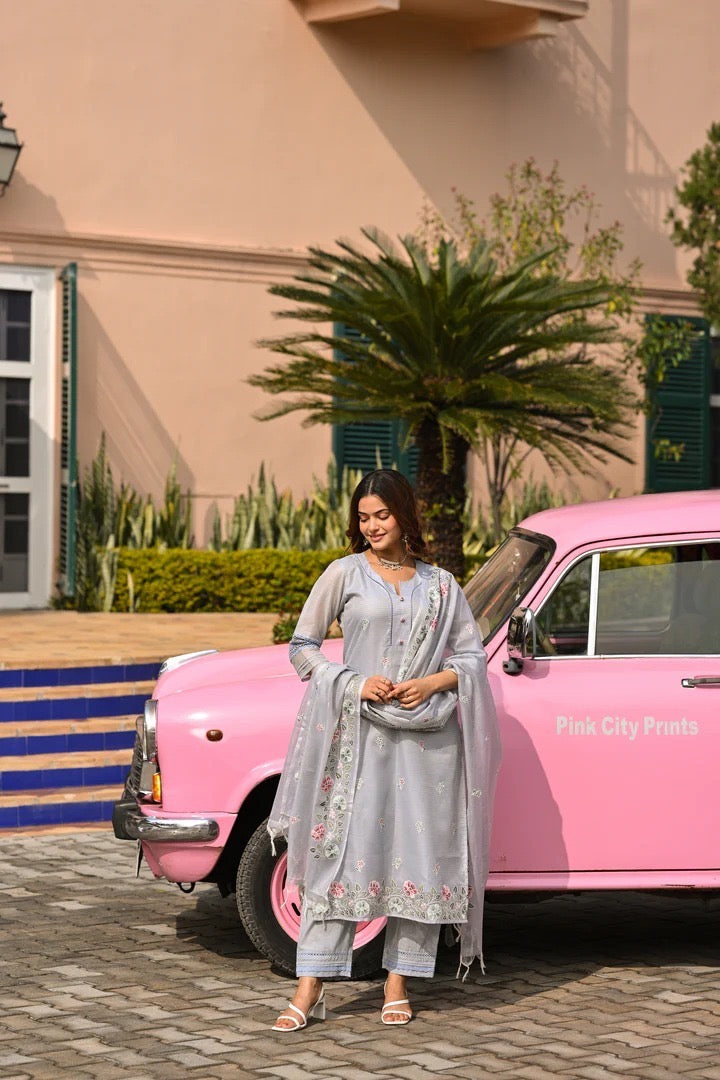 Its soft pastel grey colour with multicolour embroidery provides a minimal yet graceful aesthetic. The breathable nature of Kota Doria makes it suitable for long hours and summer seasons. The pants come in a straight-fit style, creating a traditional yet contemporary ensemble that is easy to maintain and style with minimal accessories.