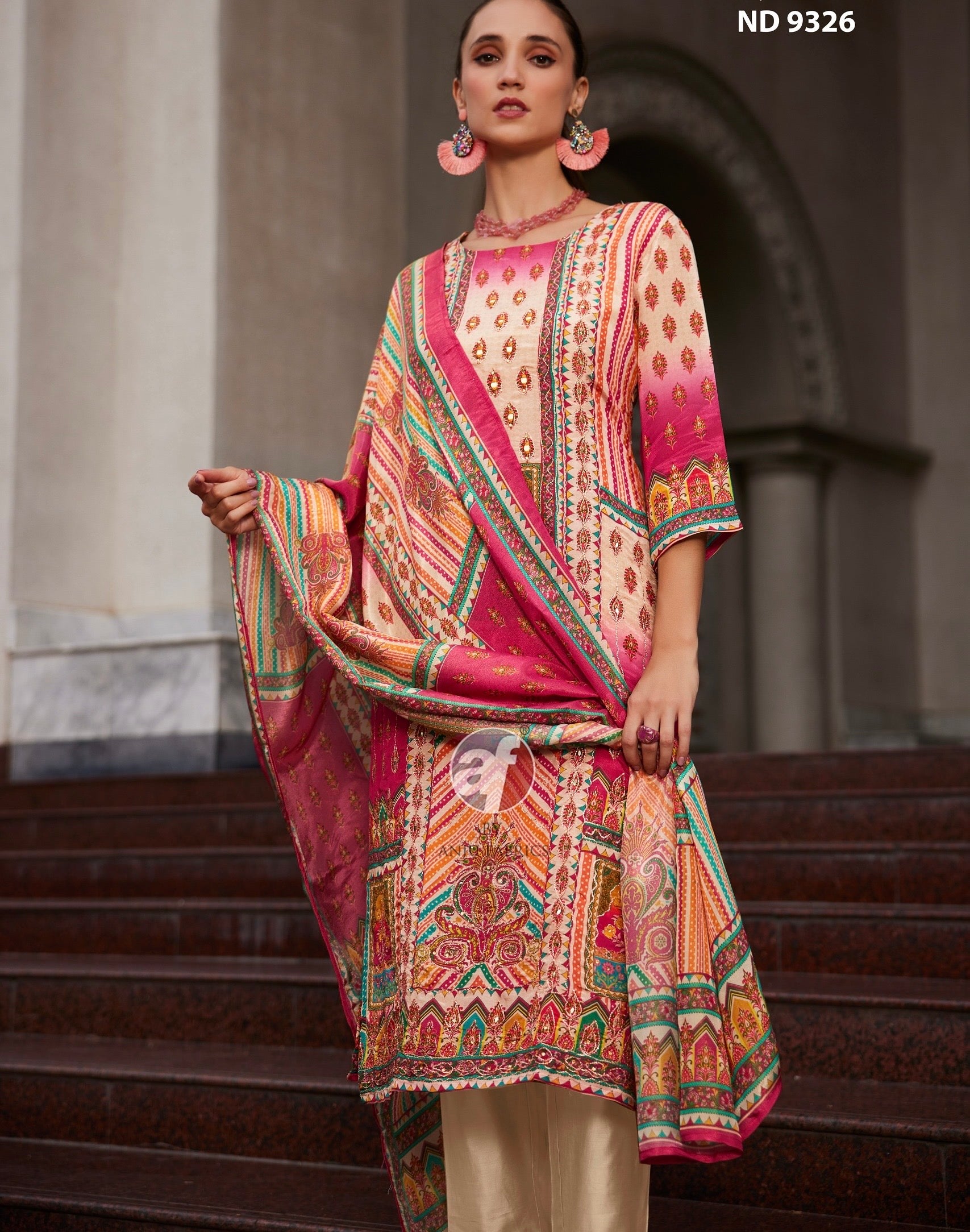 Fabric: Tissue shimmer kurta with position print, pants, and coordinating dupatta