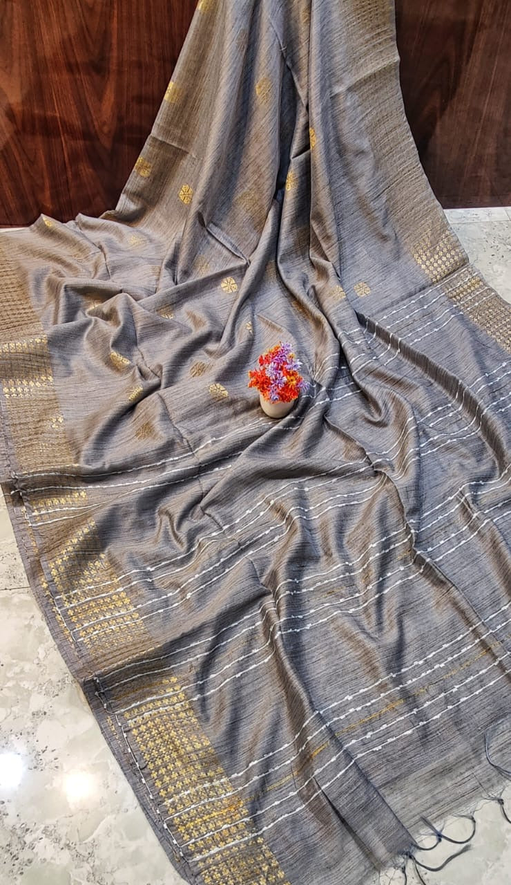 This Muga silk saree embodies elegance, artistry, and comfort in one refined ensemble. Crafted from premium-quality silk, the fabric is exceptionally soft and feather-light, offering an effortless drape and graceful fall. The saree is adorned with intricate weaving butta designs across the body, showcasing traditional craftsmanship with fine detailing. Its highlight is the sequence-adorned pallu, which adds a touch of shimmer and sophistication, making the saree ideal for festive and special occasions. A running blouse piece is included, designed to complement the weaving and sequence accents of the drape. Available in a variety of elegant colors and designs, this saree is perfect for weddings, cultural gatherings, or festive celebrations, offering timeless charm with a contemporary edge.