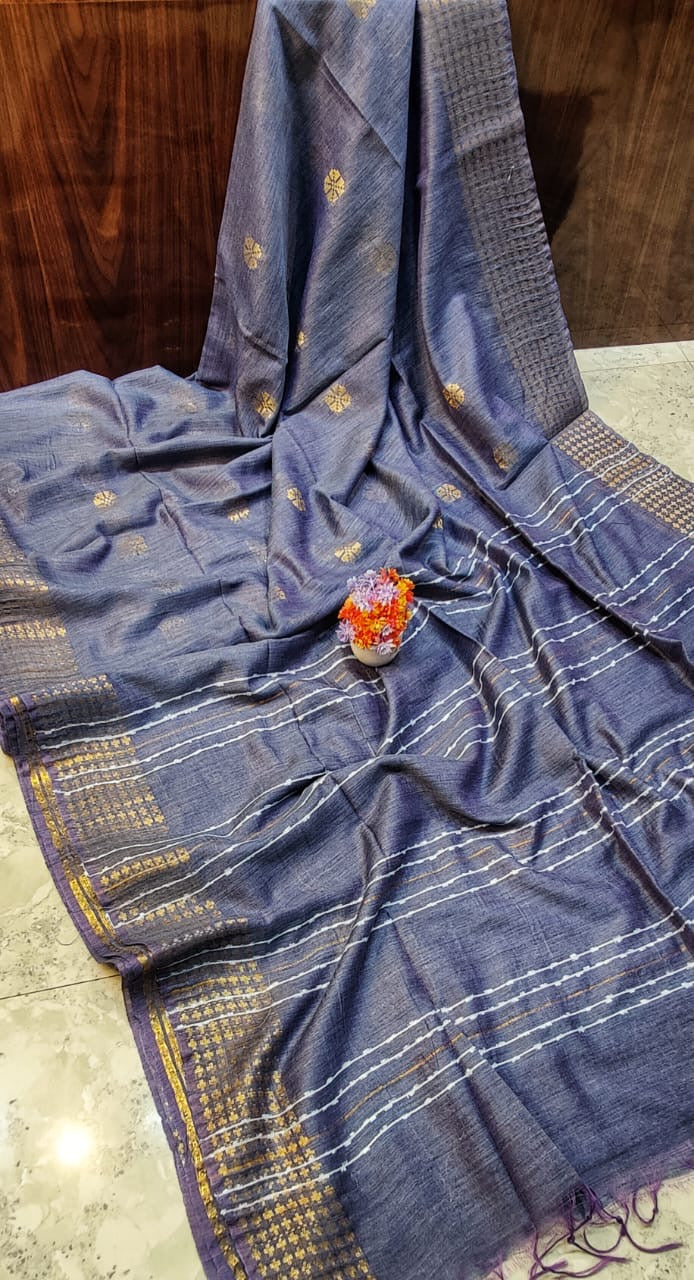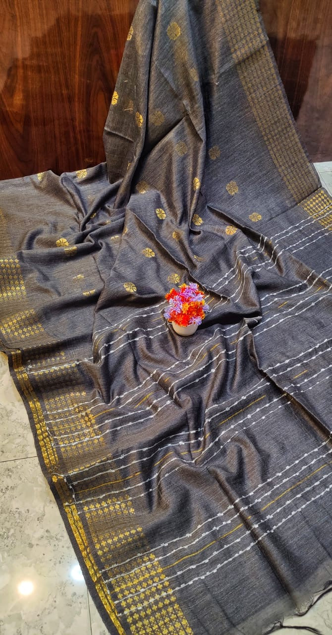 Technical Details: Muga silk base, weaving motifs, sequence detailing on pallu, blouse fabric included