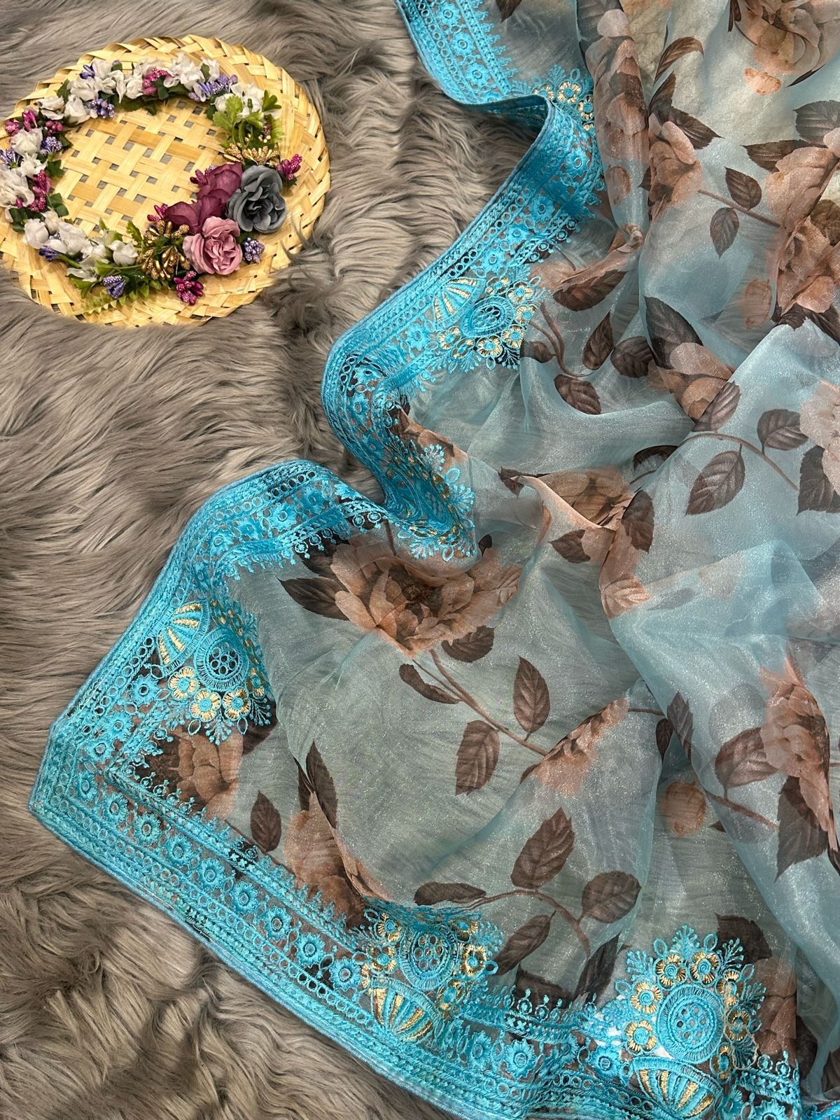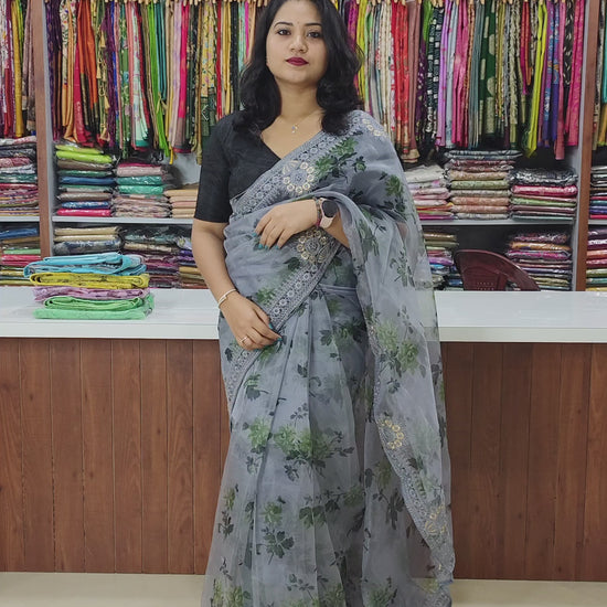 Organza Silk Saree with Digital Print and Viscos Thread Work – Banglori Silk Blouse Included