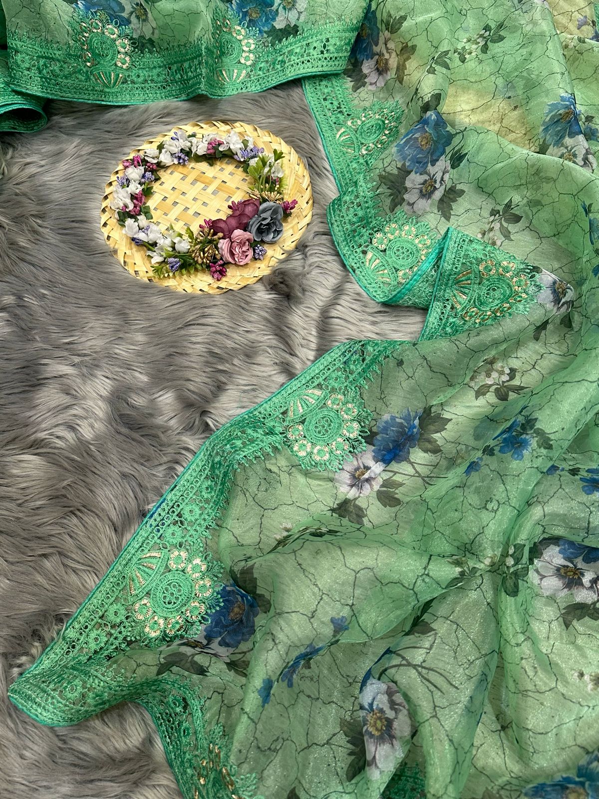The saree is beautifully enhanced with digital prints and intricate Viscos thread work, creating a refined contrast of modern design and traditional craftsmanship. Its delicate patterns highlight the transparency and fluidity of organza silk, making it a perfect ensemble for weddings, festive occasions, and evening gatherings.