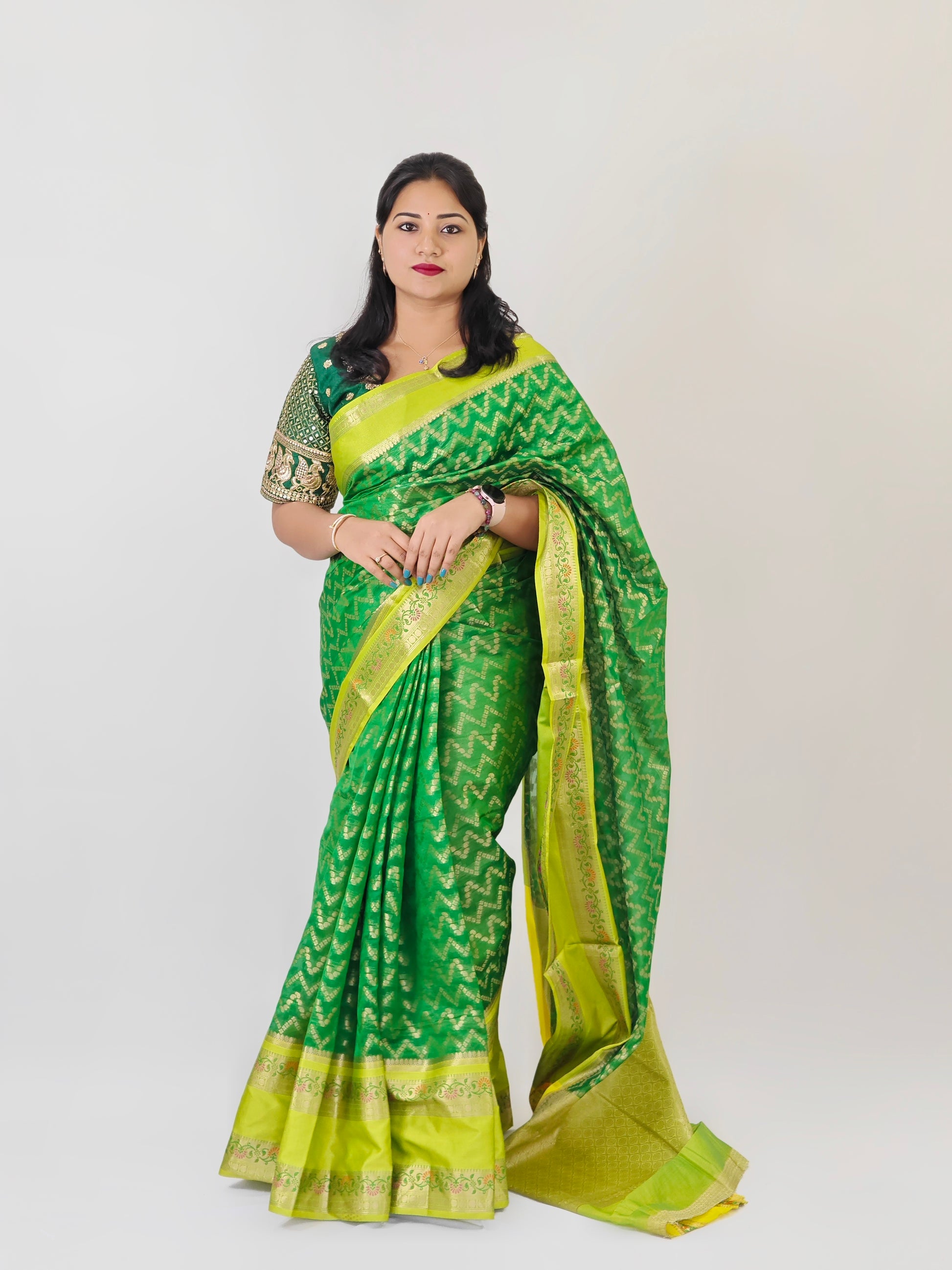 Blouse piece: Included (unstitched, contrast color with zari work)