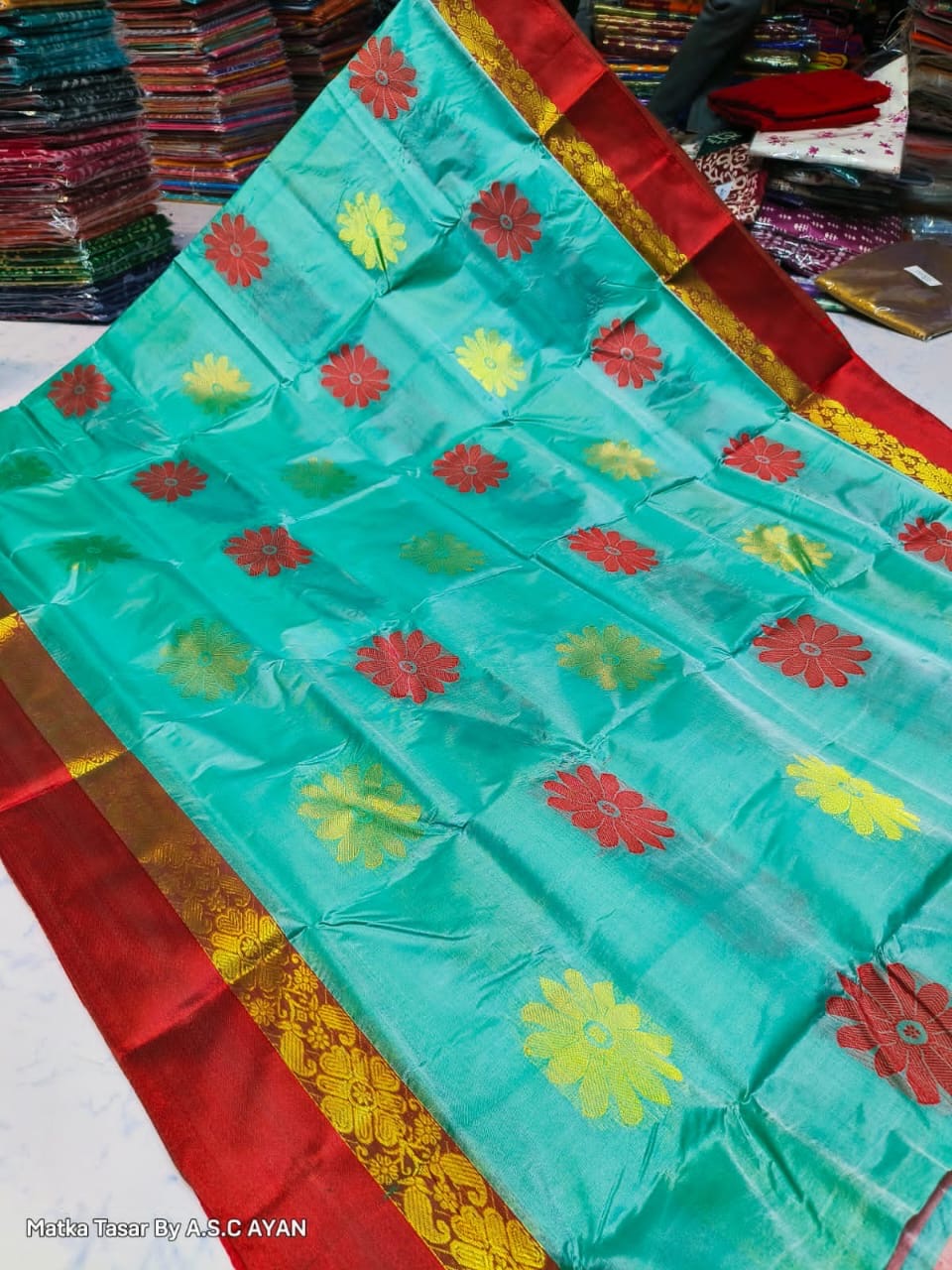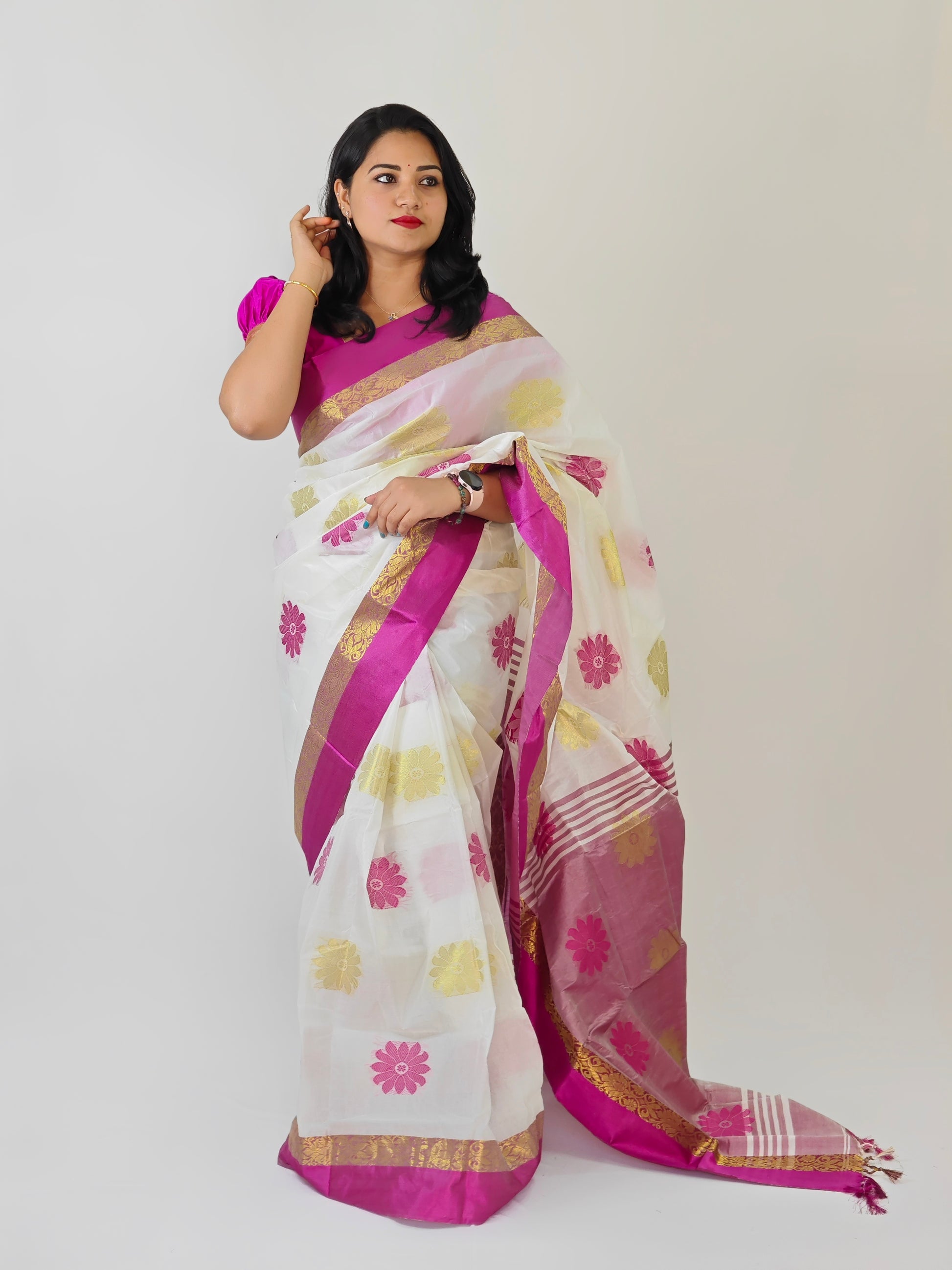 Work: All-over woven suto motifs with golden zari detailing