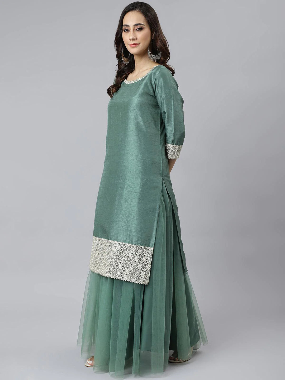 SEO Keywords: mint green chinnon kurta palazzo set, embroidered festive chinnon suit, mint green palazzo dupatta ethnic wear, festive chinnon outfit for women, wedding ethnic wear set