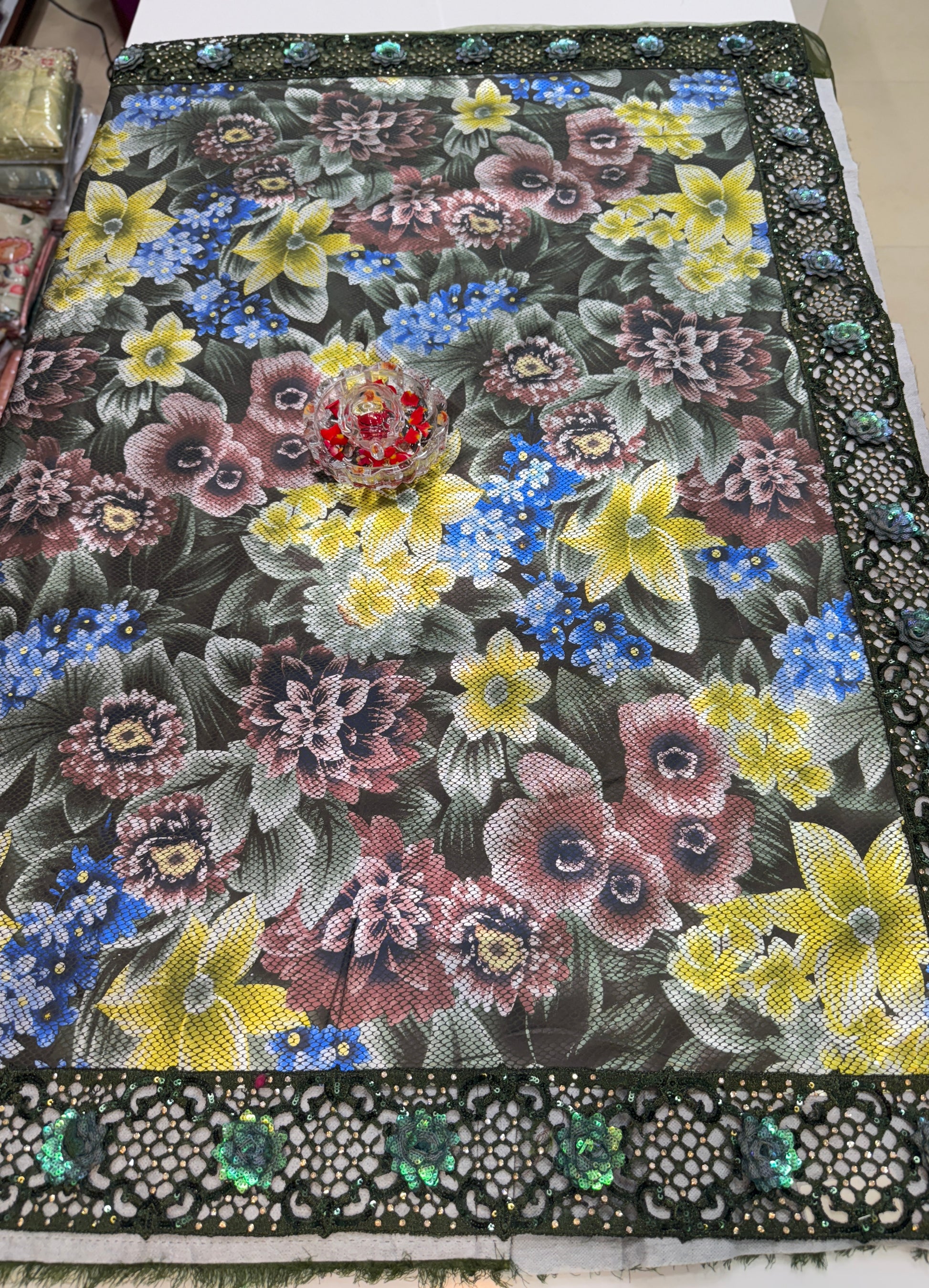 The intricate lace border adorned with sequin floral motifs and fine detailing enhances its luxurious appeal.