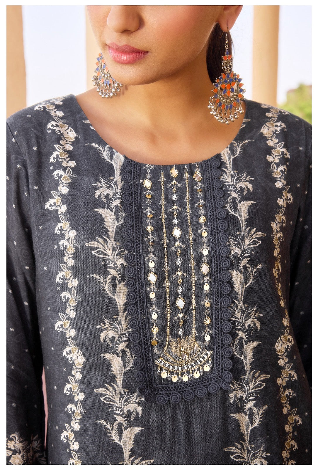 This 3-piece kurta pant dupatta set is crafted in soft digital-printed muslin with elegant moti sequence and mirror hand touching work on the neckline. Lined for comfort, the kurta is paired with a matching shantoon pant and a beautifully finished lace border dupatta. Designed to deliver both ethnic elegance and breathable comfort, this ensemble is ideal for festive gatherings, poojas, and graceful daytime events.