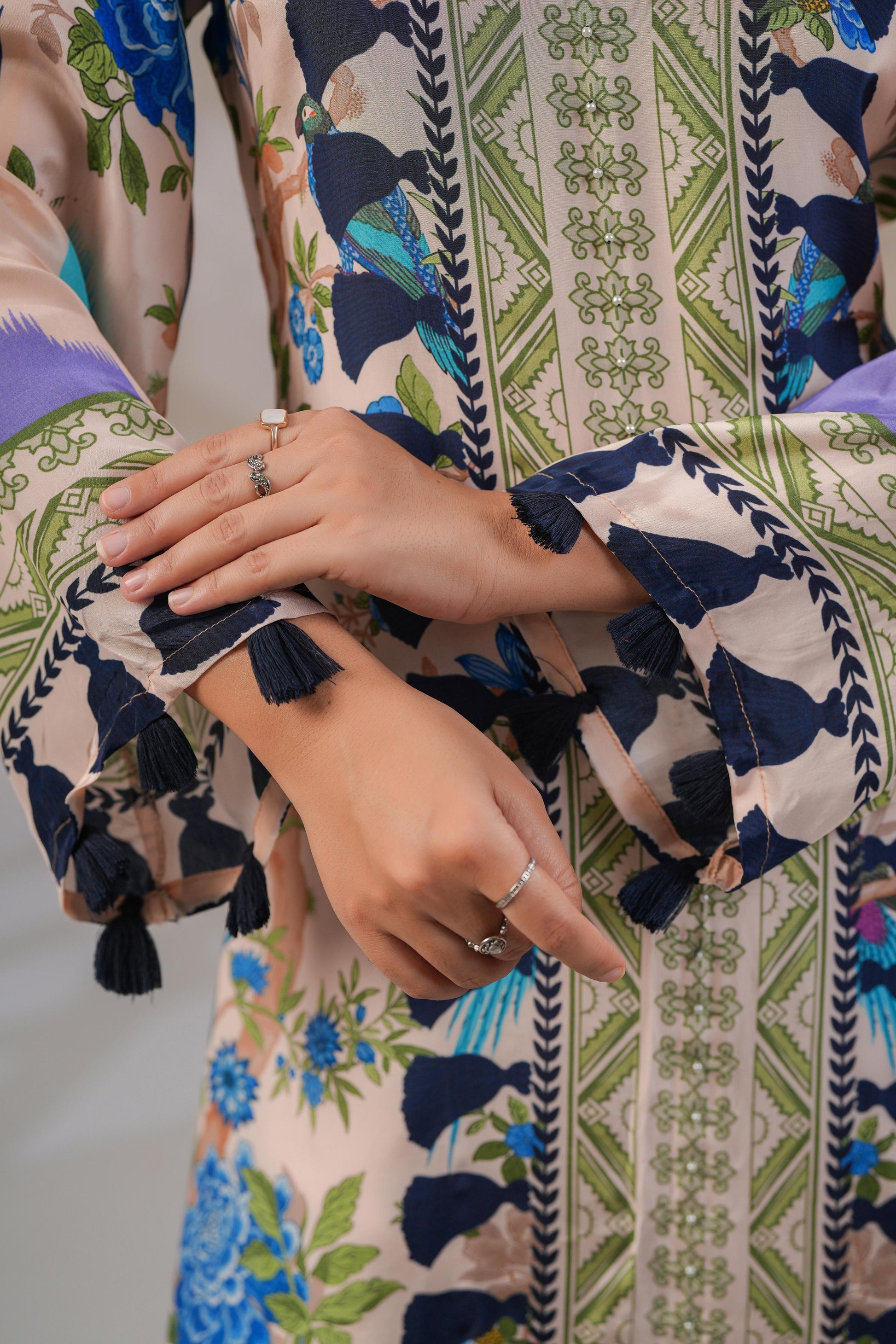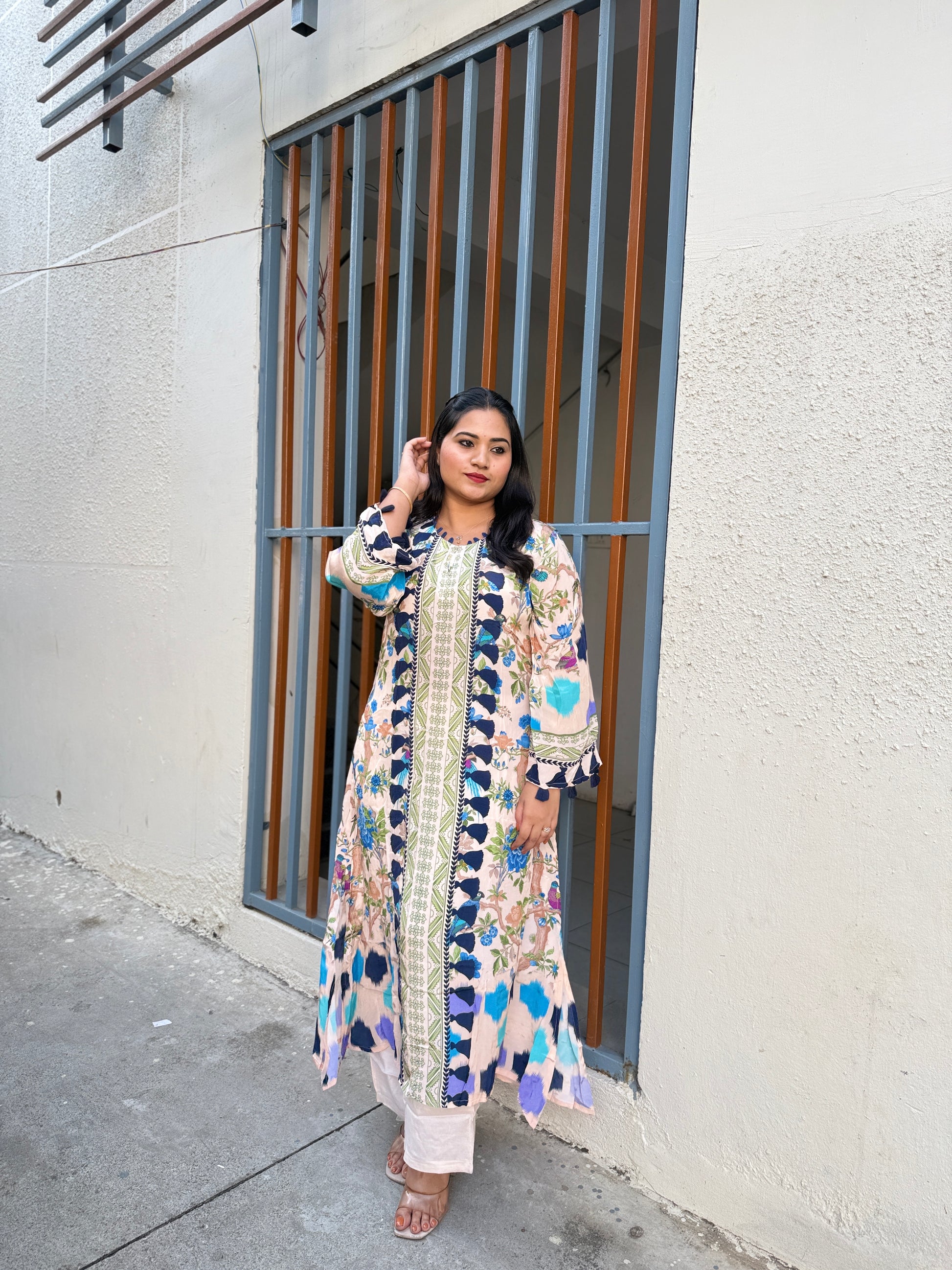 Redefine ethnic elegance with this premium kurta pant set featuring digital placement prints on soft crepe fabric. The straight-cut kurta is enhanced with tassel detailing on the hem and sleeves, adding a touch of artisanal charm. Paired with sleek shantoon pants for a polished finish, this outfit is perfect for semi-formal gatherings, festive brunches, and graceful daytime dressing. Designed for women who value refined fashion with modern flair.