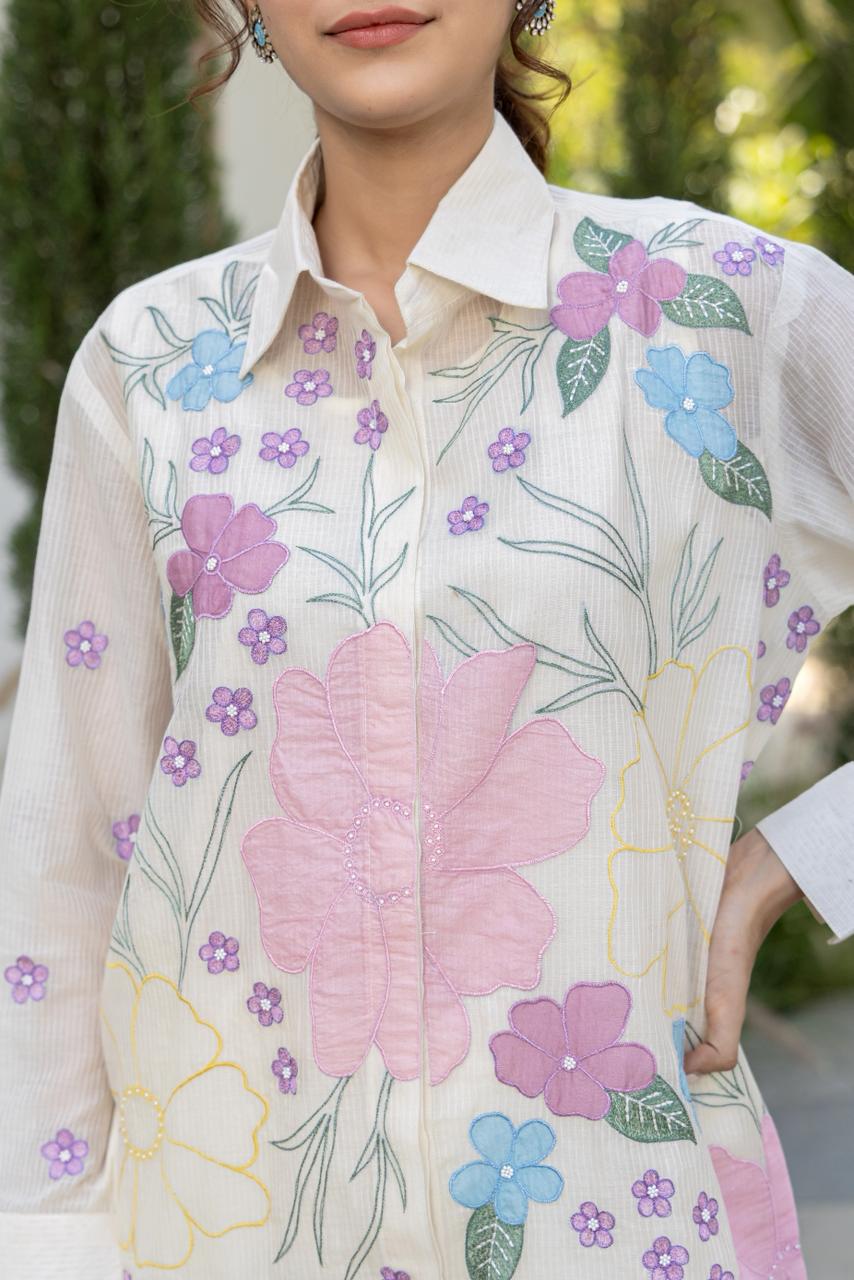 Designed as a fully stitched two-piece outfit, this mul chanderi co-ord set provides ease of movement and breathable comfort. The floral print and applique detailing add visual interest while keeping the overall silhouette clean and wearable. Suitable for casual outings, day events, office wear, and light festive occasions, this women’s co-ord set blends comfort with contemporary ethnic styling.