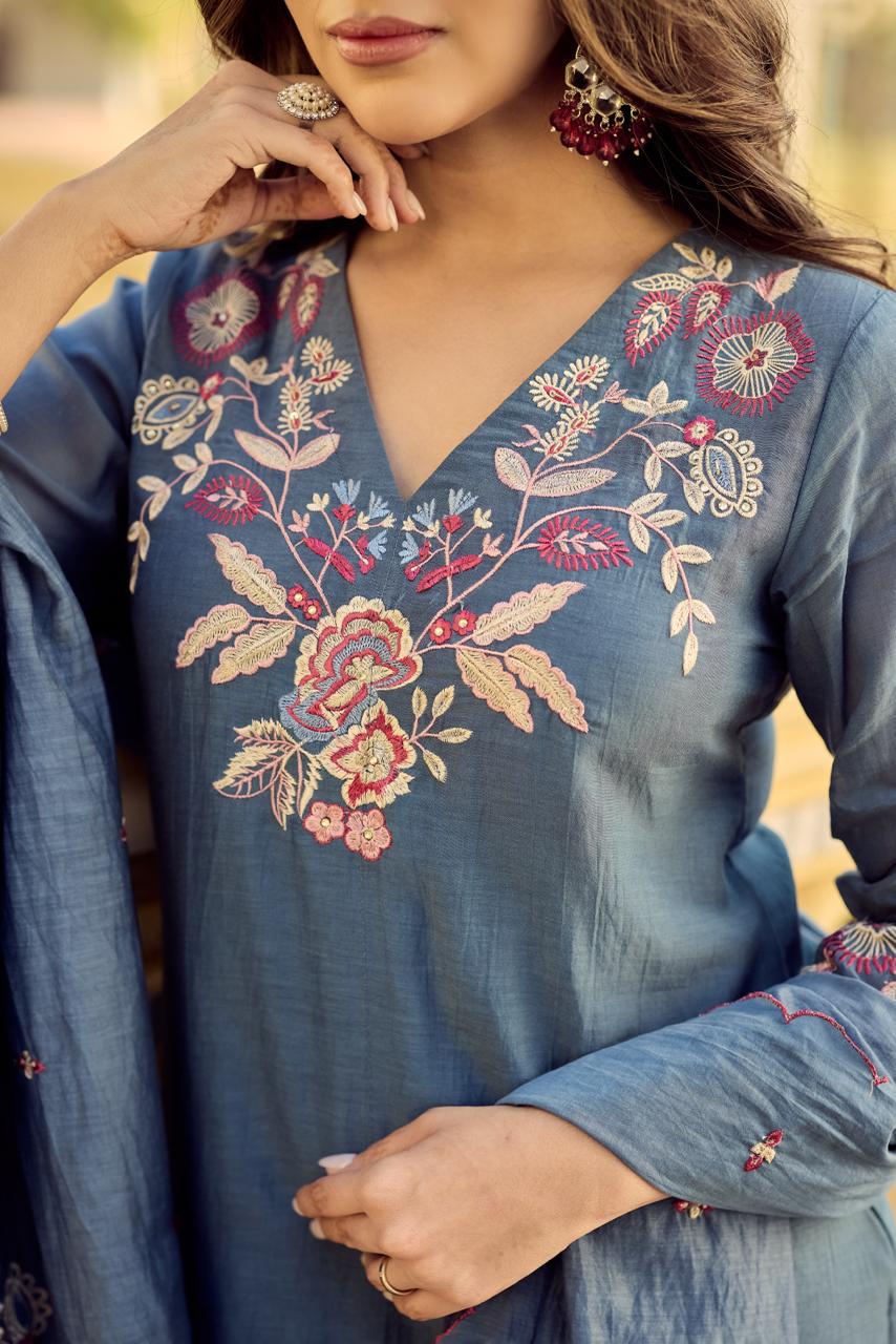 Mul Chanderi Embroidered Kurti Pant Dupatta Set for Women, V-Neck Straight Kurta with Matching Bottom and Dupatta