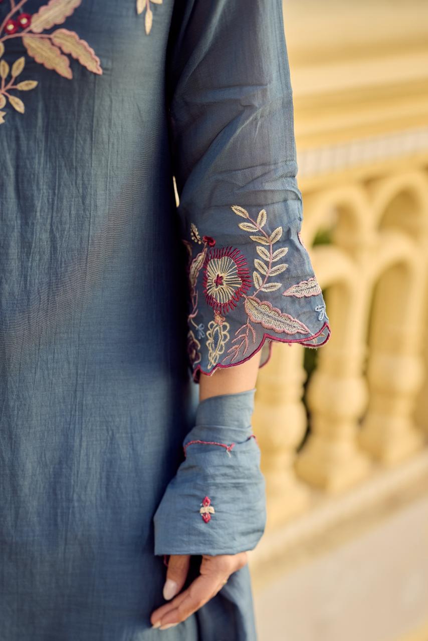 The embroidery detailing, soft mul chanderi fabric, and coordinated styling make this set a practical addition to a women’s ethnic wardrobe. It pairs well with minimal jewellery, traditional footwear, or contemporary accessories depending on the occasion. This outfit is intended for women looking for an elegant yet wearable ethnic set with refined fabric and subtle handcrafted appeal.