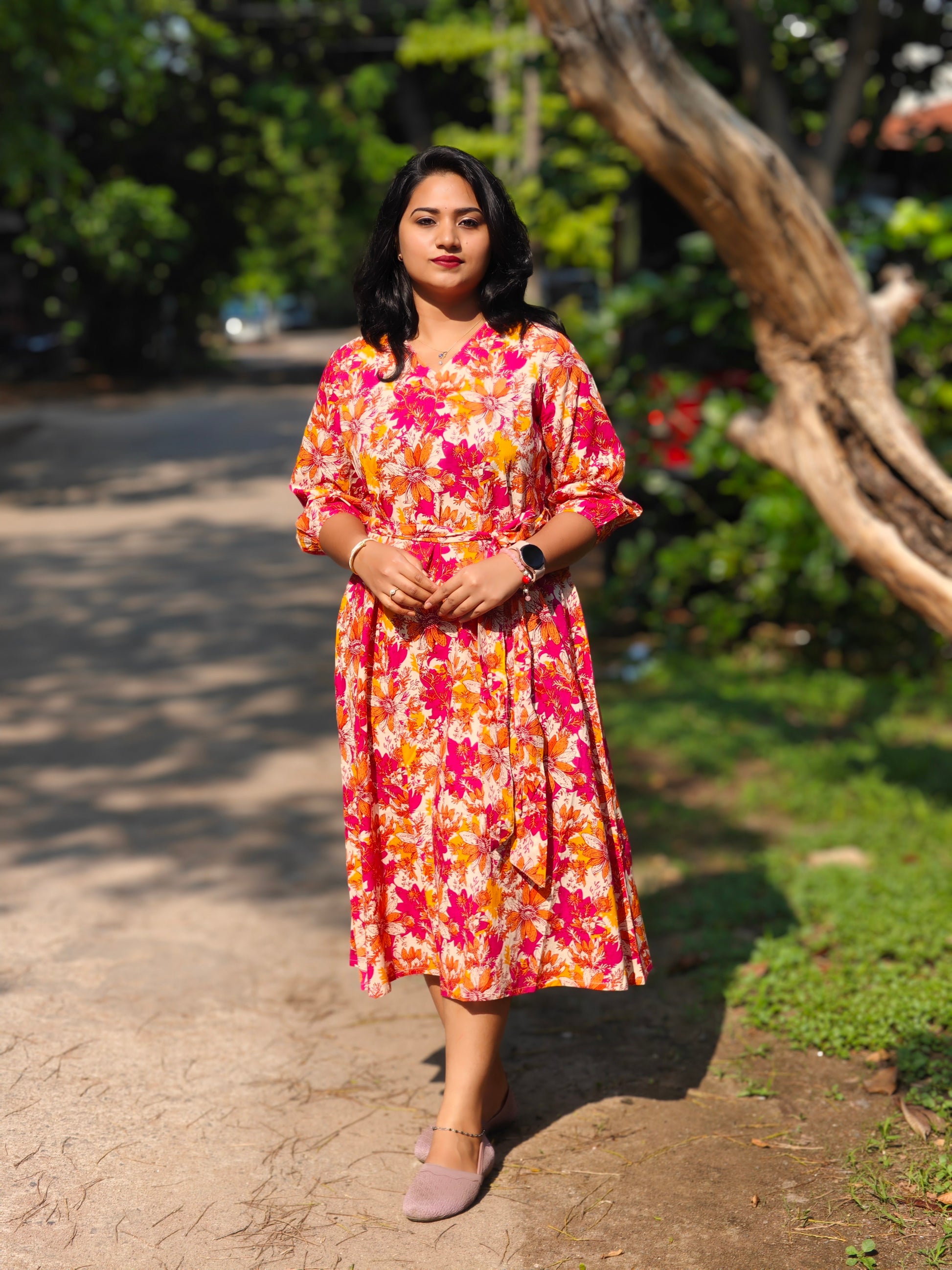 Add a burst of colour to your wardrobe with this Multicolour Cotton Floral A-Line Midi Dress, perfect for brightening up any occasion. Crafted from soft, breathable cotton, it features an eye-catching floral print in vibrant shades of pink, orange, and white. The A-line silhouette ensures a flattering fit, while the V-neckline and self-tie waist belt enhance shape and style. Designed for comfort and versatility, this fully stitched calf-length dress is suitable for a wide range of body types, making it an ideal choice for casual outings, brunches, vacations, and summer gatherings.