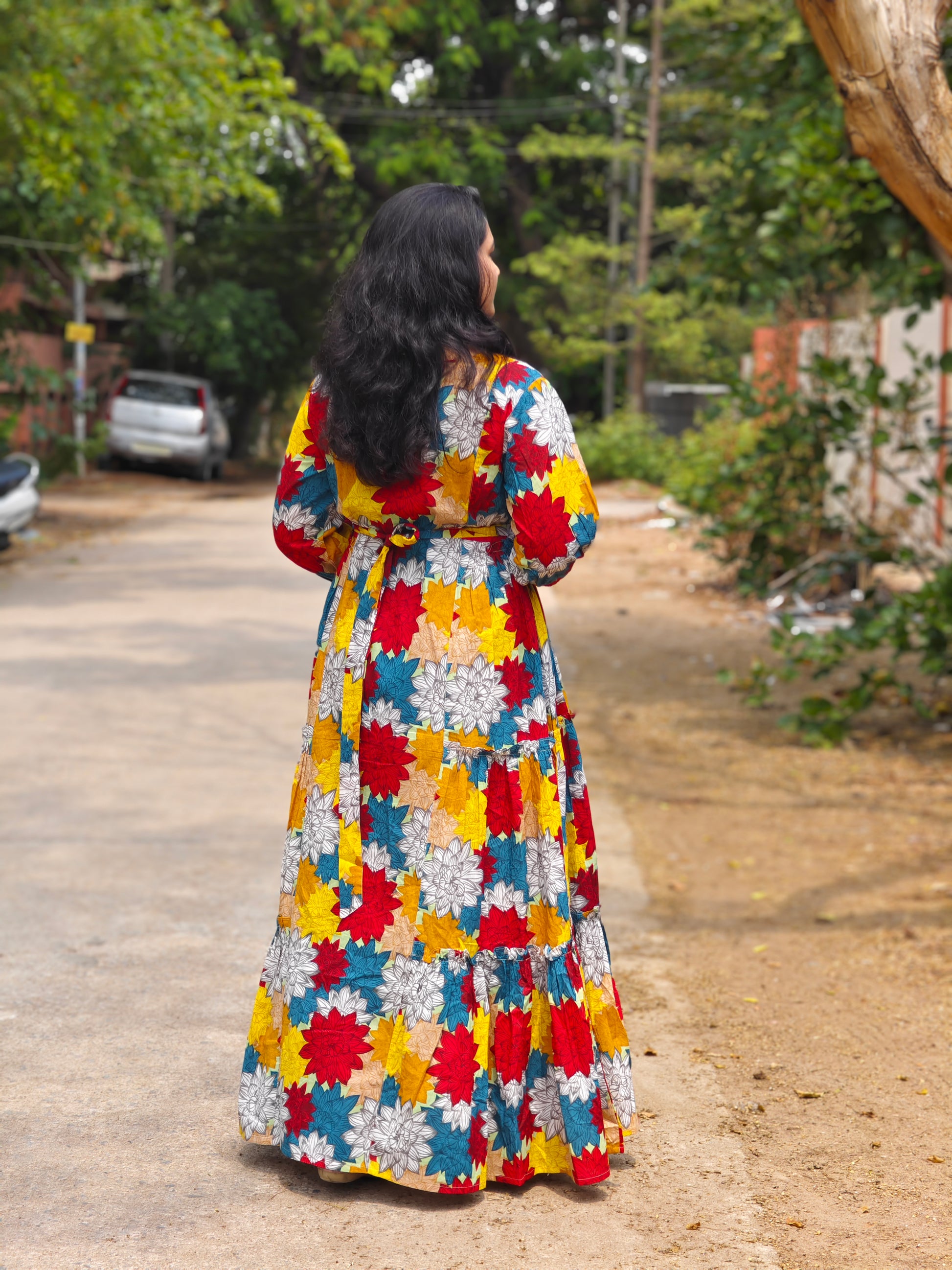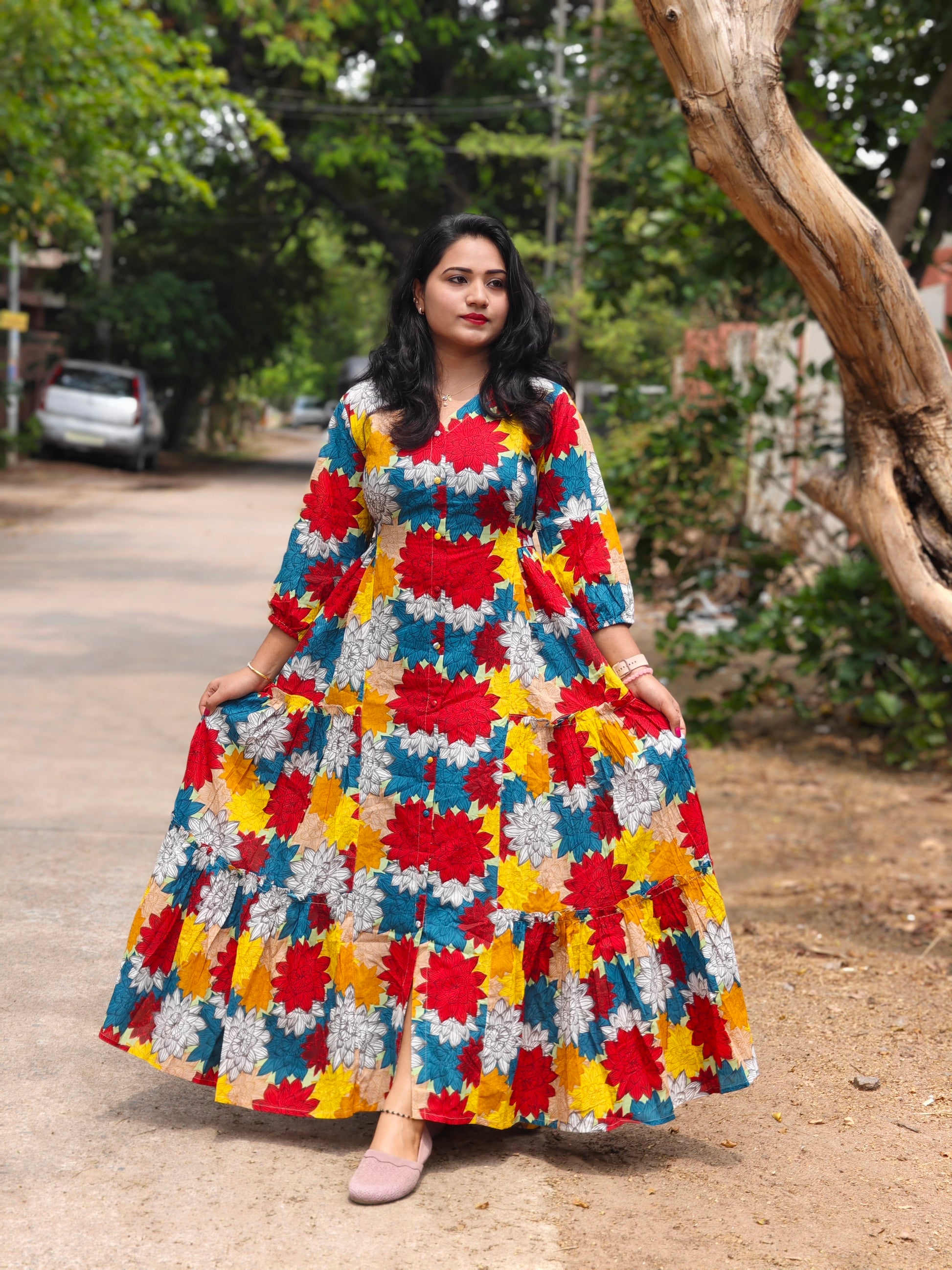 The Radiant Blooms Cotton Fiesta Dress is a celebration of color and style. Crafted from premium cotton, it features a vibrant arrangement of floral panels in a variety of hues, creating a lively yet elegant look. The flared silhouette offers graceful movement, while intricate floral detailing enhances its feminine appeal. Lightweight and breathable, this dress is perfect for day outings, casual gatherings, or special occasions, offering both comfort and standout style.