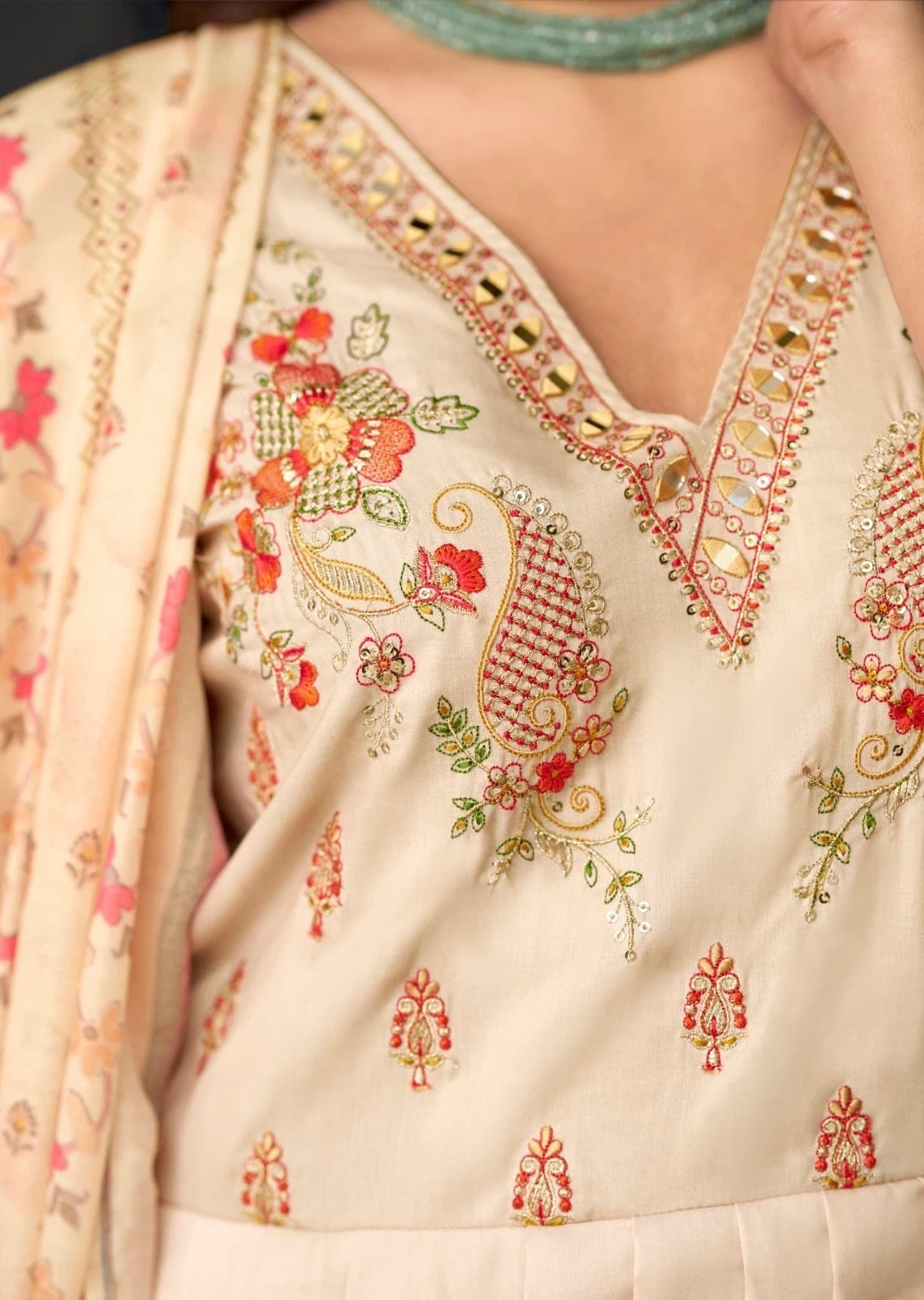 Work/Design: Digital print, fancy embroidery, khatli mirror handwork, lace detailing on pant, latkan finish on dupatta