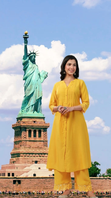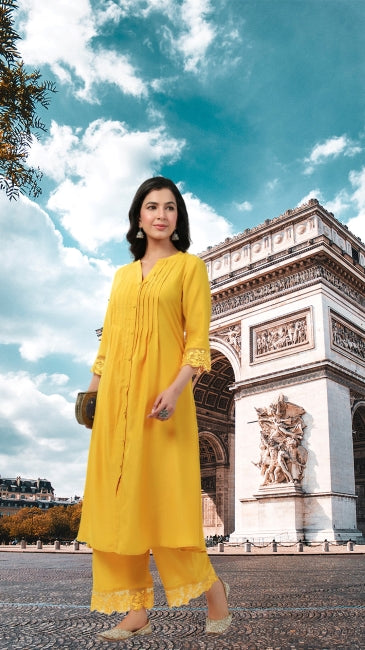 Grace meets comfort in this yellow A-line kurta pant set crafted from soft and flowy muslin fabric. The kurta features a full front button placket, delicate pleats, and intricately embroidered sleeve cuffs for a touch of elegance. Paired with matching pants enhanced with scalloped lace at the hem, this set offers a refined silhouette that's perfect for daytime celebrations, festive get-togethers, or elegant office looks.