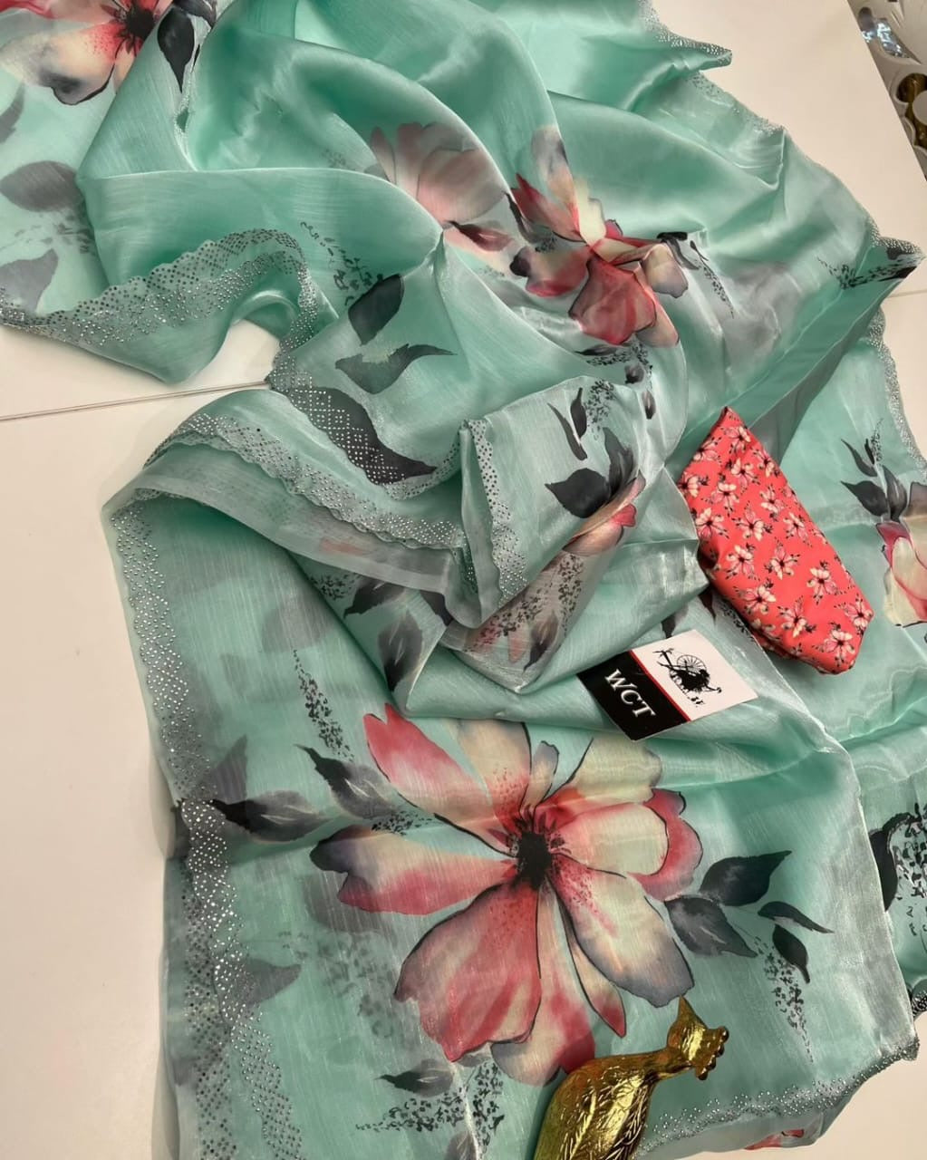 Heavy Soft Silk Saree with Swarovski Work and Floral Digital Print