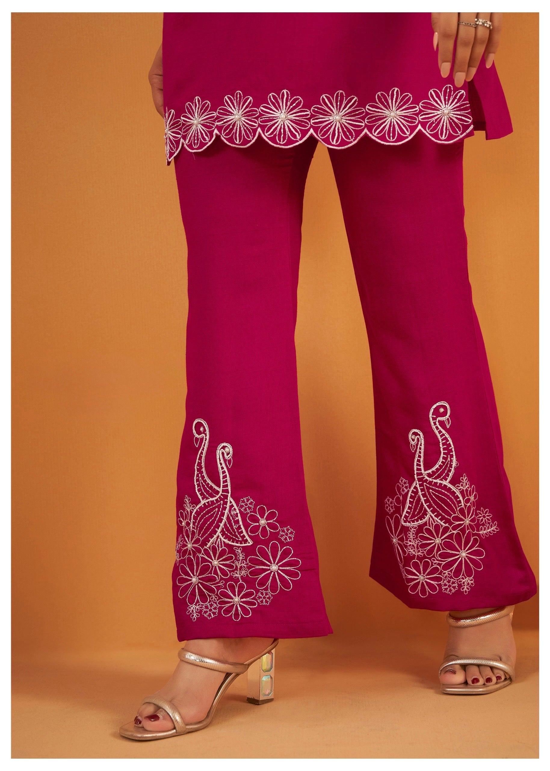 Paired with a matching bottom measuring approximately 39 inches in length, the straight-fit pants provide a balanced structure that complements the top. Coordinated surface work on the bottom maintains harmony throughout the set, creating a seamless, elevated look that’s easy to style and wear.