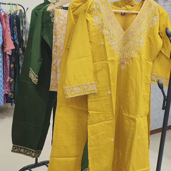The Afghani Suit Set is a refined blend of festive elegance and intricate craftsmanship. Made from luxurious heavy Chanderi fabric, the kurta features delicate embroidery that adds depth and sophistication to its design. Measuring 46 inches in length, it pairs with comfortable 38-inch pants for a balanced silhouette. The ensemble is completed with a floral print organza dupatta in enchanting Mahendi and Yellow shades, offering a light, airy contrast to the rich Chanderi base. Available in sizes M (38) and L (40), this set is perfect for festive occasions, cultural events, and special celebrations.