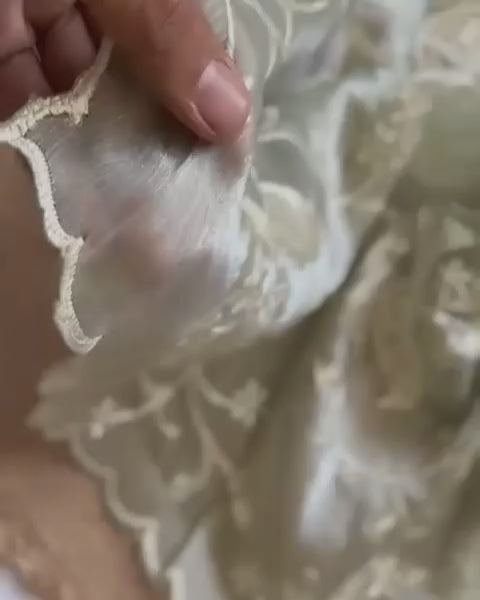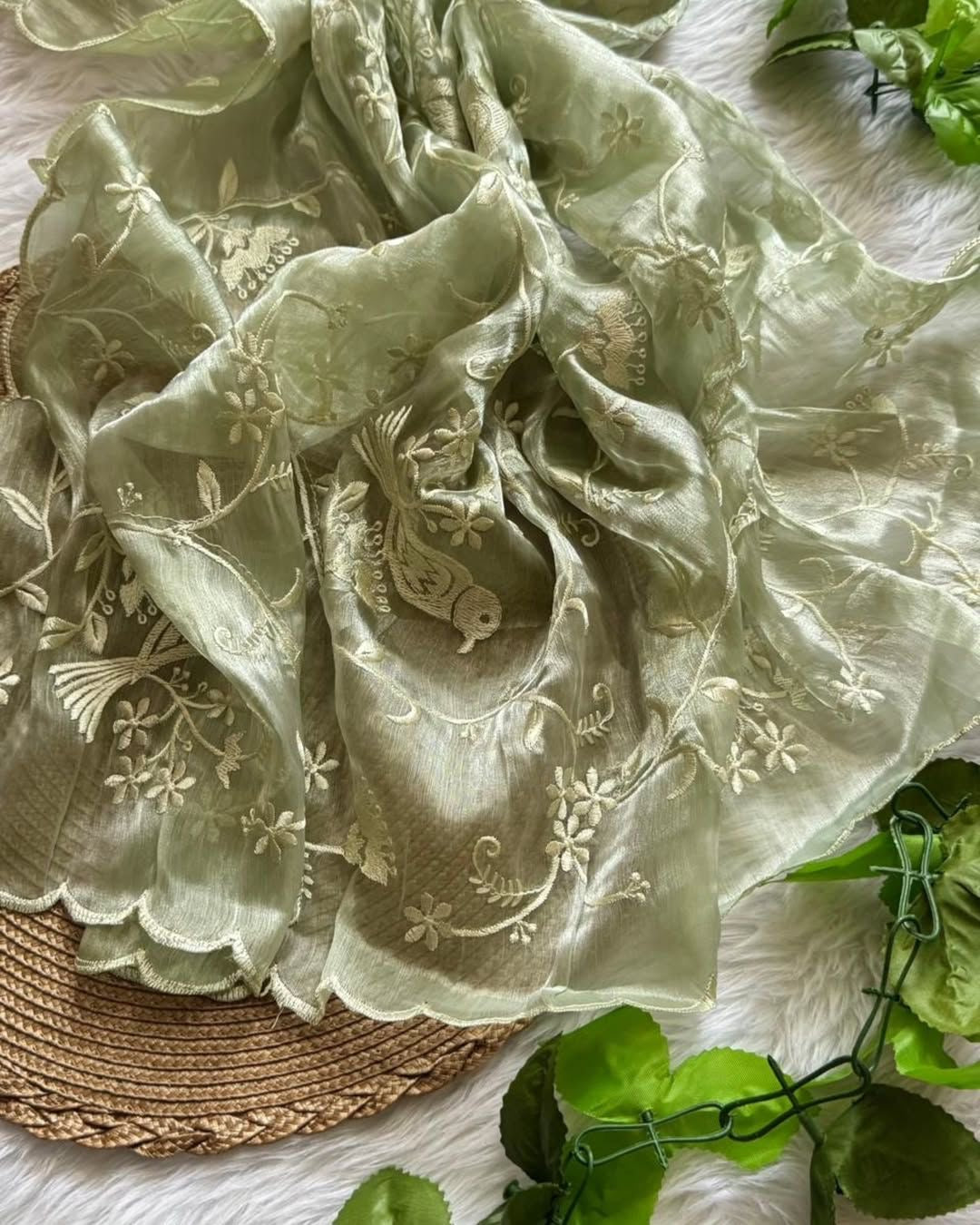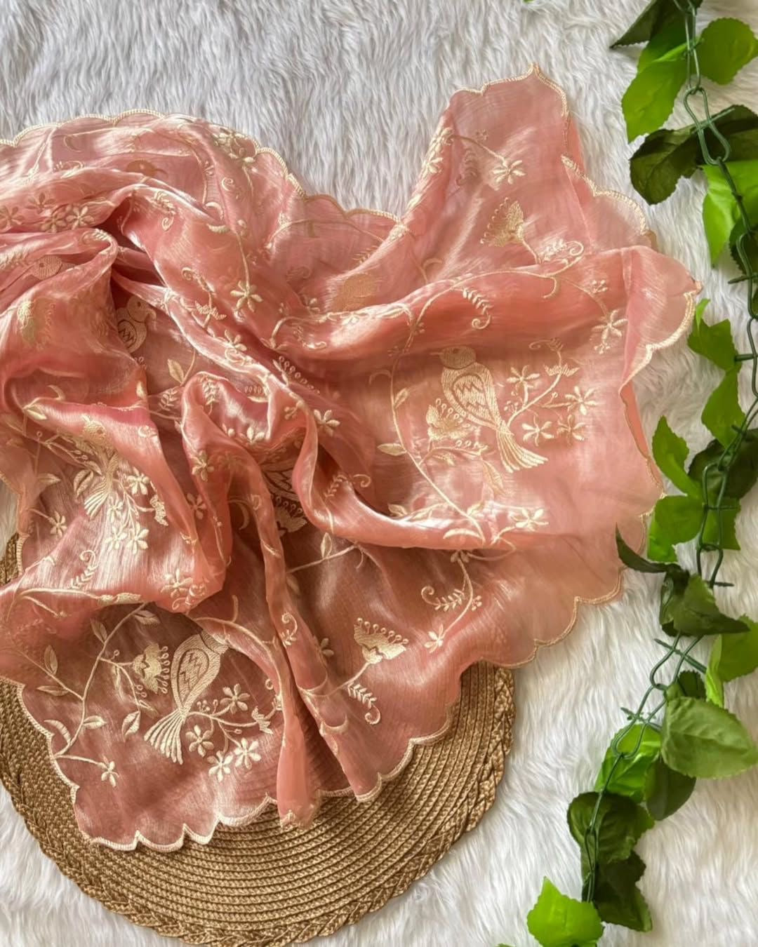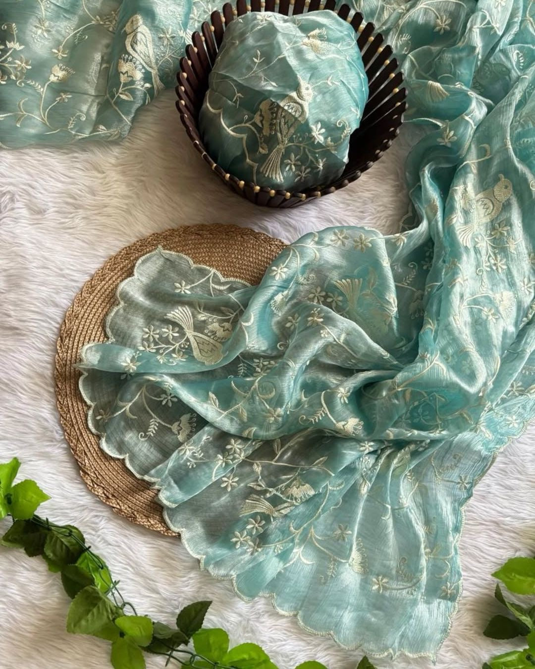 Work/Design: Chikankari-inspired embroidery with bird motifs, C-pallu style