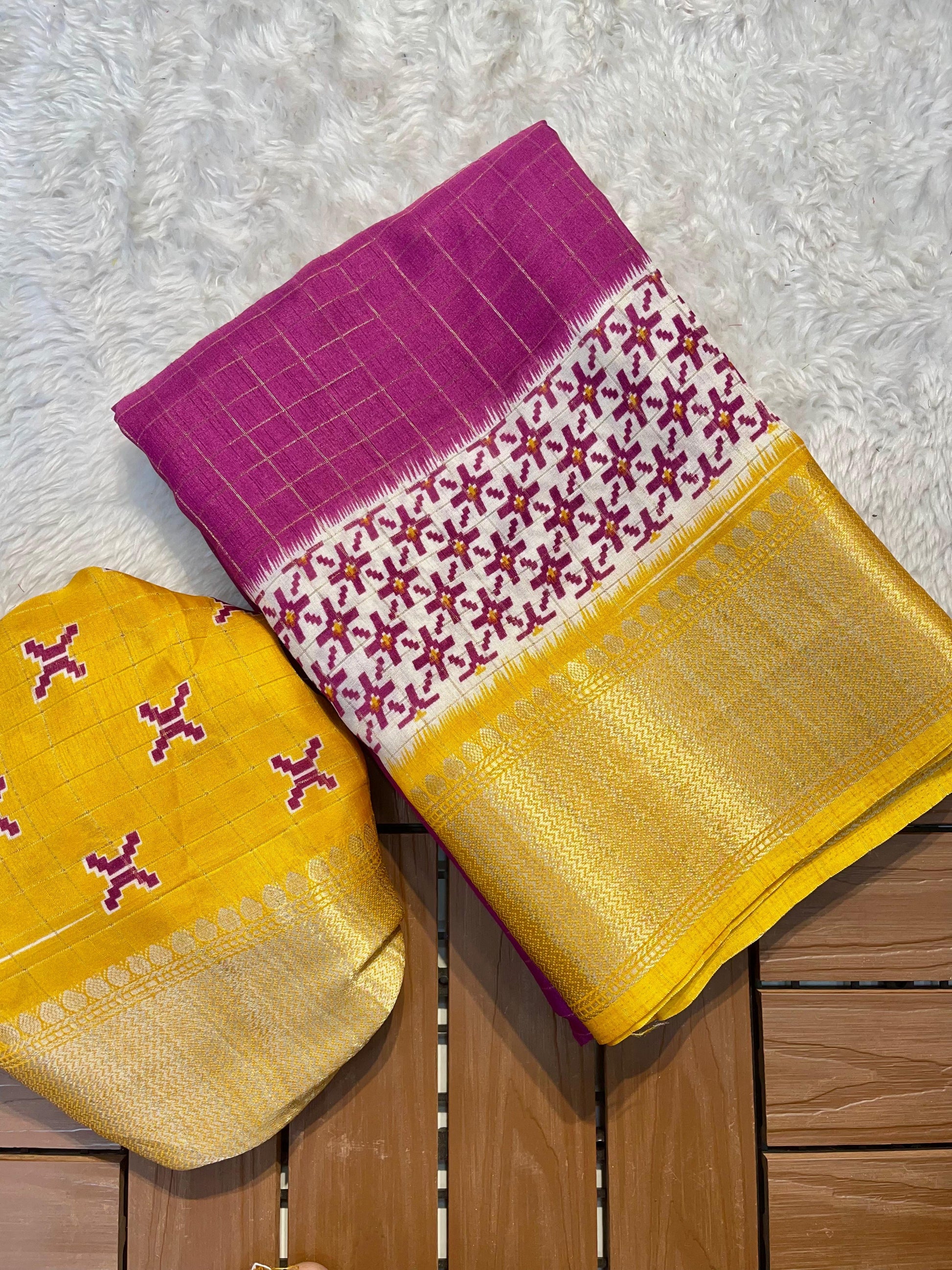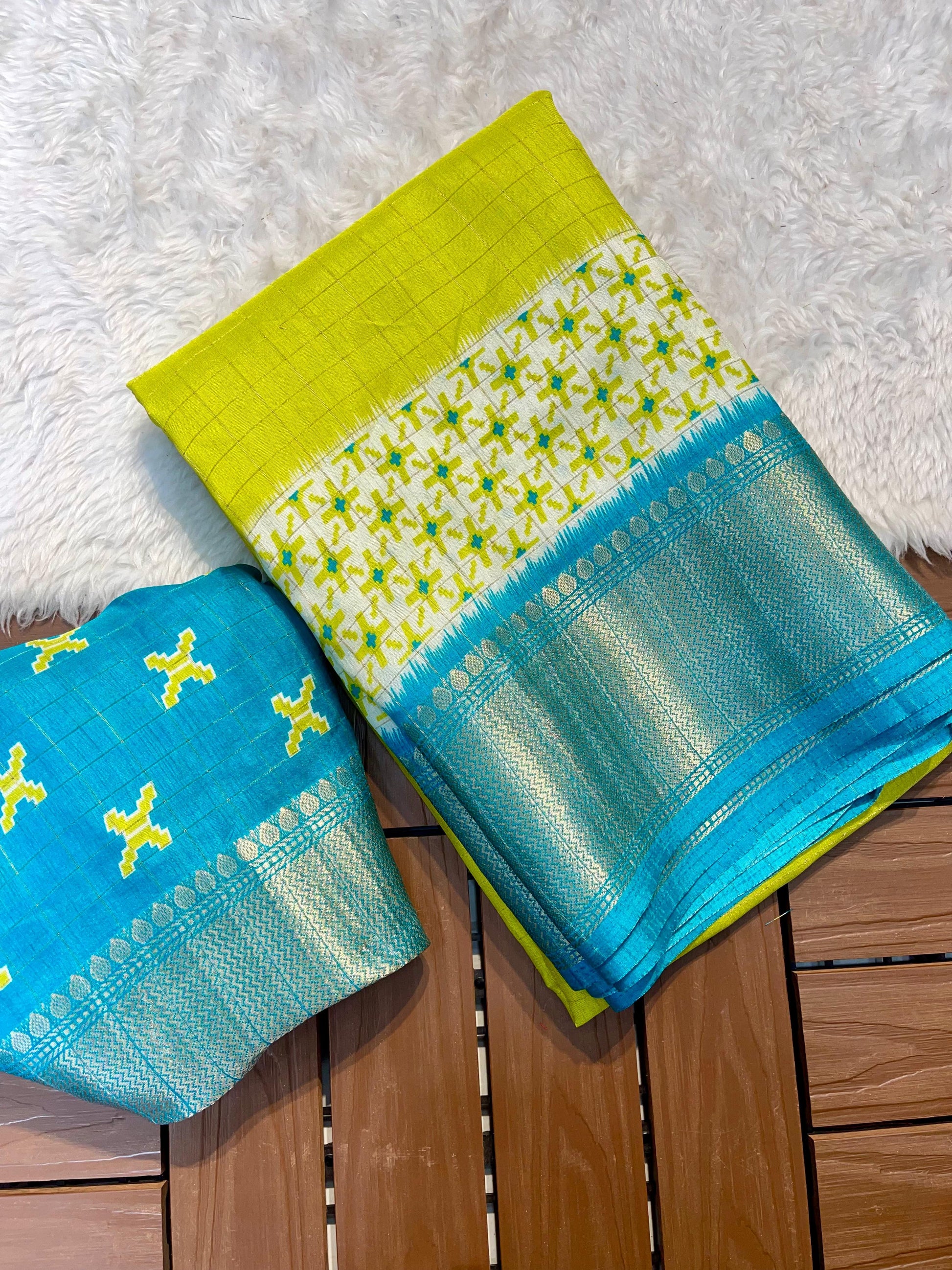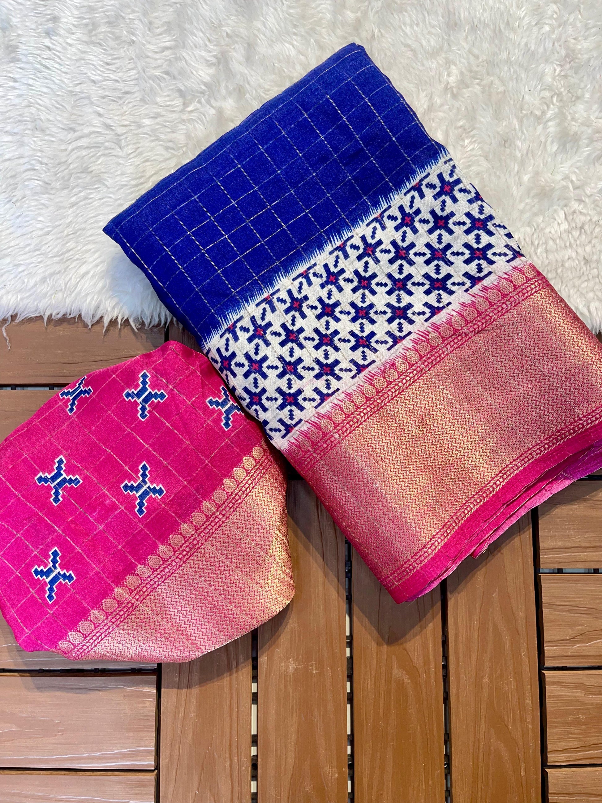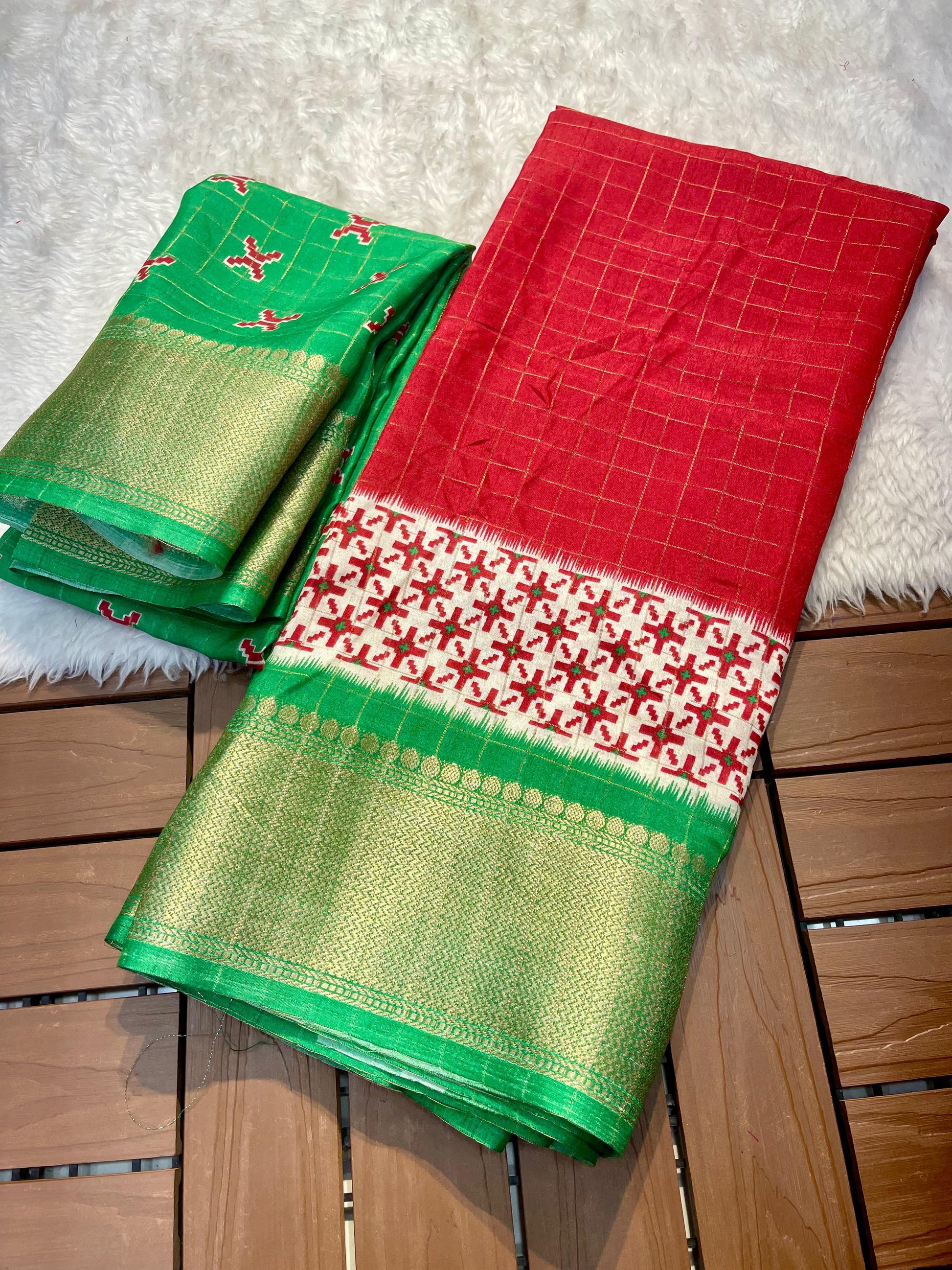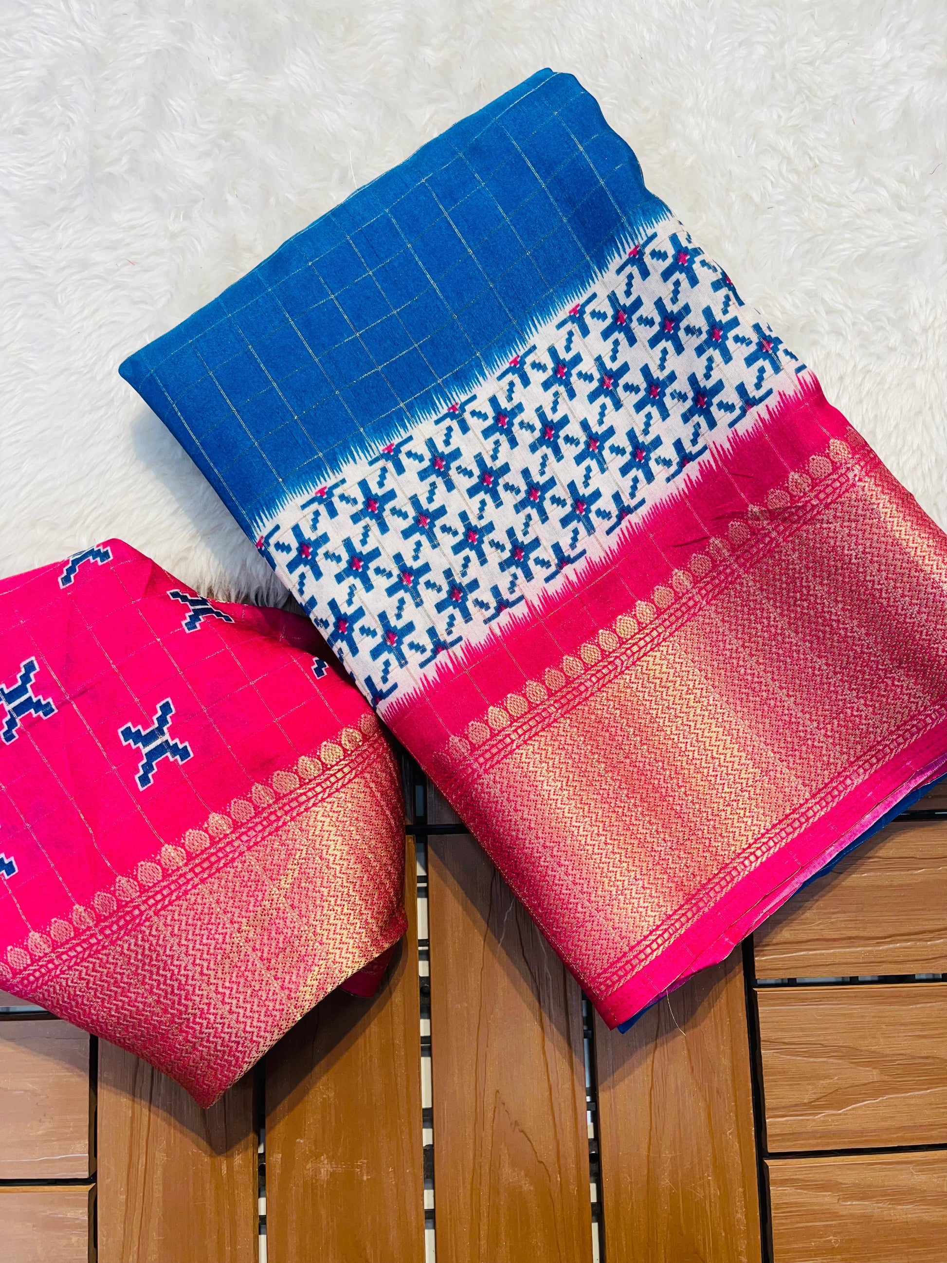 This Digital Kalamkari Printed Saree brings together the elegance of traditional Indian art with the sophistication of modern weaving. Crafted from luxurious Dola silk, also known for its Kanchi-style border work, it features a striking 9-inch gold zari pencil jacquard Pattu border. The saree’s detailed digital Kalamkari print enhances its cultural appeal, while the woven zari accents on the pallu and border create a rich, festive look. A matching blouse piece is included to complete the coordinated ensemble. Available in multiple colours, this saree is perfect for weddings, festive celebrations, and cultural gatherings.