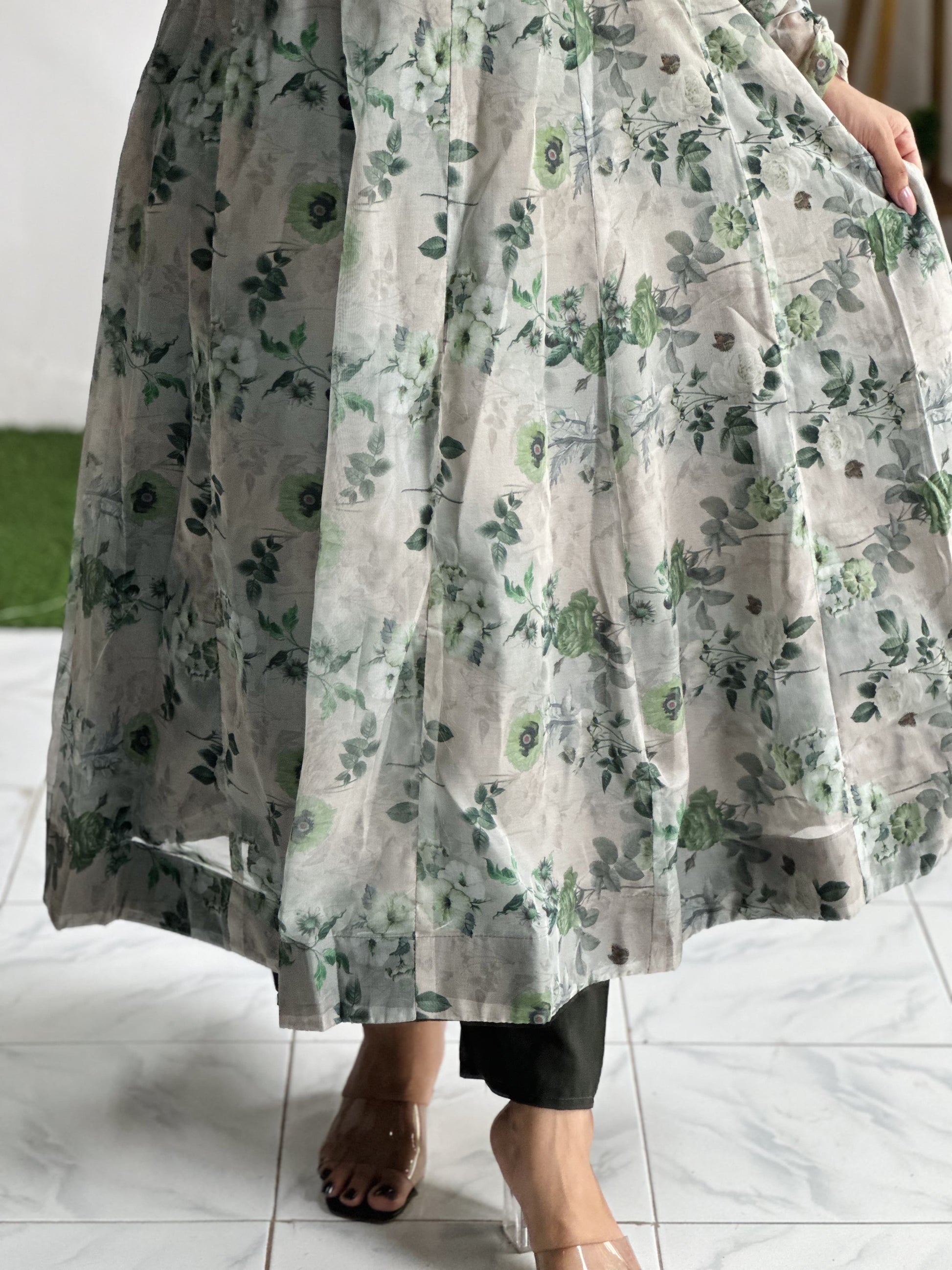 This Organza silk Anarkali suit set is crafted to combine elegance with comfort, making it an excellent choice for festive occasions, weddings, and cultural gatherings. The Anarkali gown is tailored from heavy pure soft Organza silk with a printed design, styled in a flared kali cut pattern. With an approximate flair of 4 meters and a length of 46–47 inches, the silhouette ensures a regal and flowing look. The addition of an attached canvas patta enhances structure and provides a graceful drape, while a micro cotton inner lining ensures breathable comfort for long hours of wear.