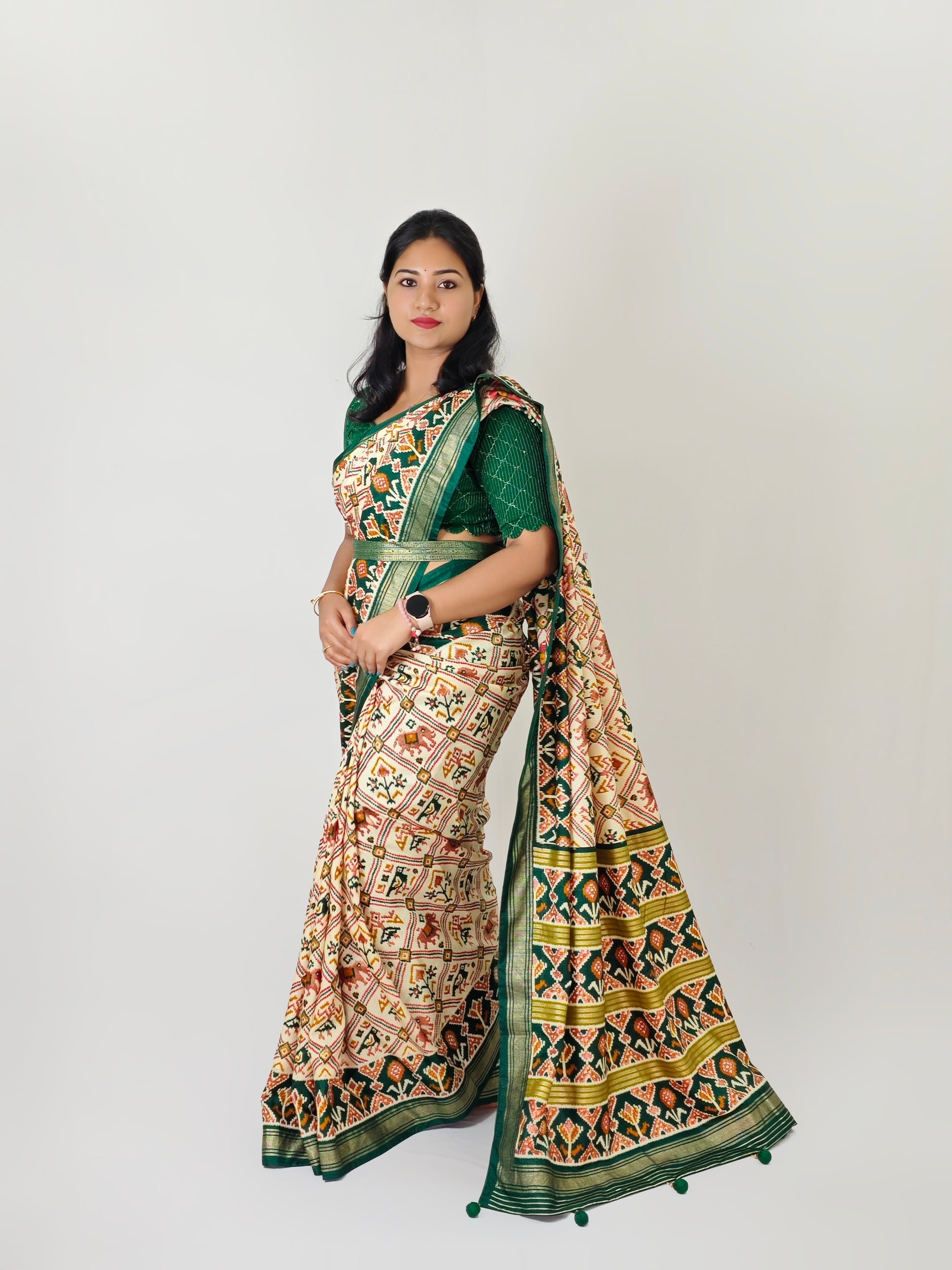 The Patola collection is a tribute to timeless tradition blended with refined elegance. Crafted from mercerized New Sigma silk, each saree features a smooth Aqwa finish that enhances the drape and sheen of the fabric. The hallmark of this collection is the Patola design, known for its artistic geometric and floral motifs, rendered with precision to reflect cultural heritage. Complementing the saree is a striking gold print that adds richness to the overall appeal, while the gold printed waist belt (Kandora) provides a contemporary touch of style and structure. Designed for women who value artistry and grace, this saree is ideal for weddings, festive celebrations, and traditional gatherings. Each piece embodies sophistication and cultural depth, making it a must-have addition to an ethnic wardrobe.
