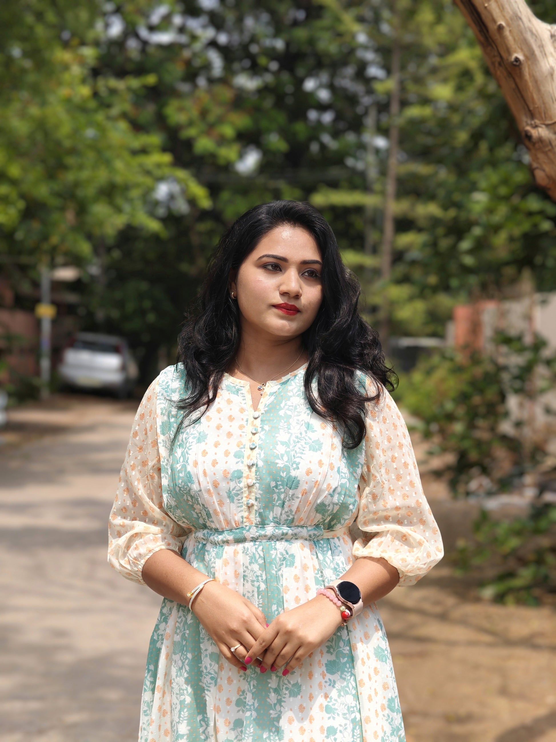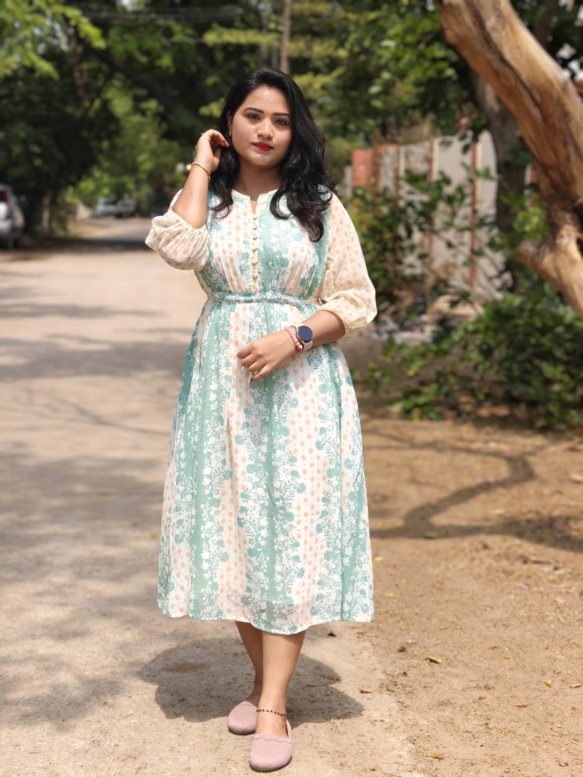 This off-white georgette midi dress offers a fresh and feminine look, perfect for casual outings and semi-formal gatherings. The dress features an all-over print in soft pastel tones with vertical floral and dotted stripe patterns for a flattering effect. Designed with a buttoned front, a gently cinched waist, and three-quarter puff sleeves, it provides both comfort and style. Crafted from lightweight georgette, it drapes beautifully and is available in sizes M to 3XL.