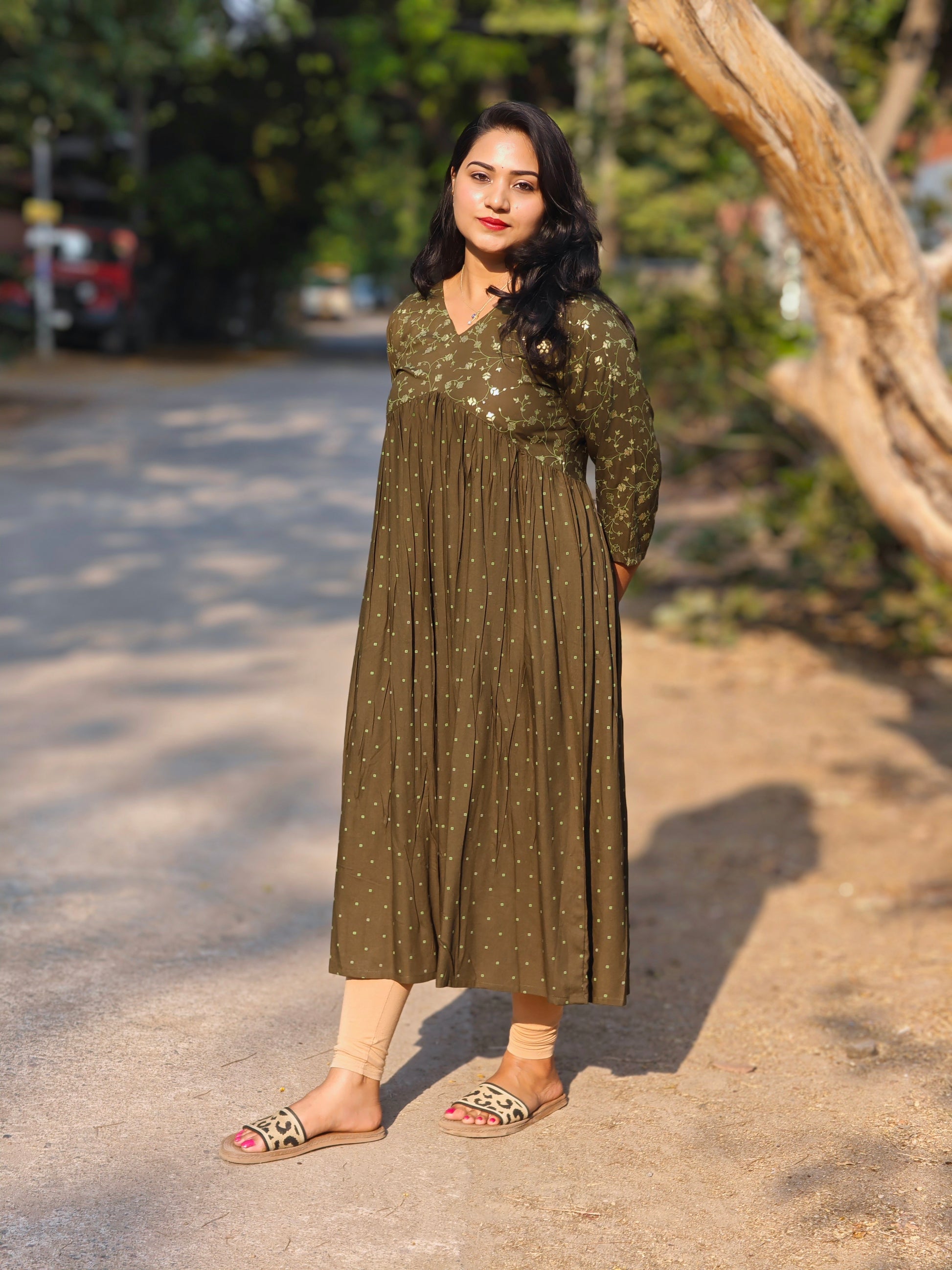 Olive Rayon Yoke Foil Printed A-Line Kurta