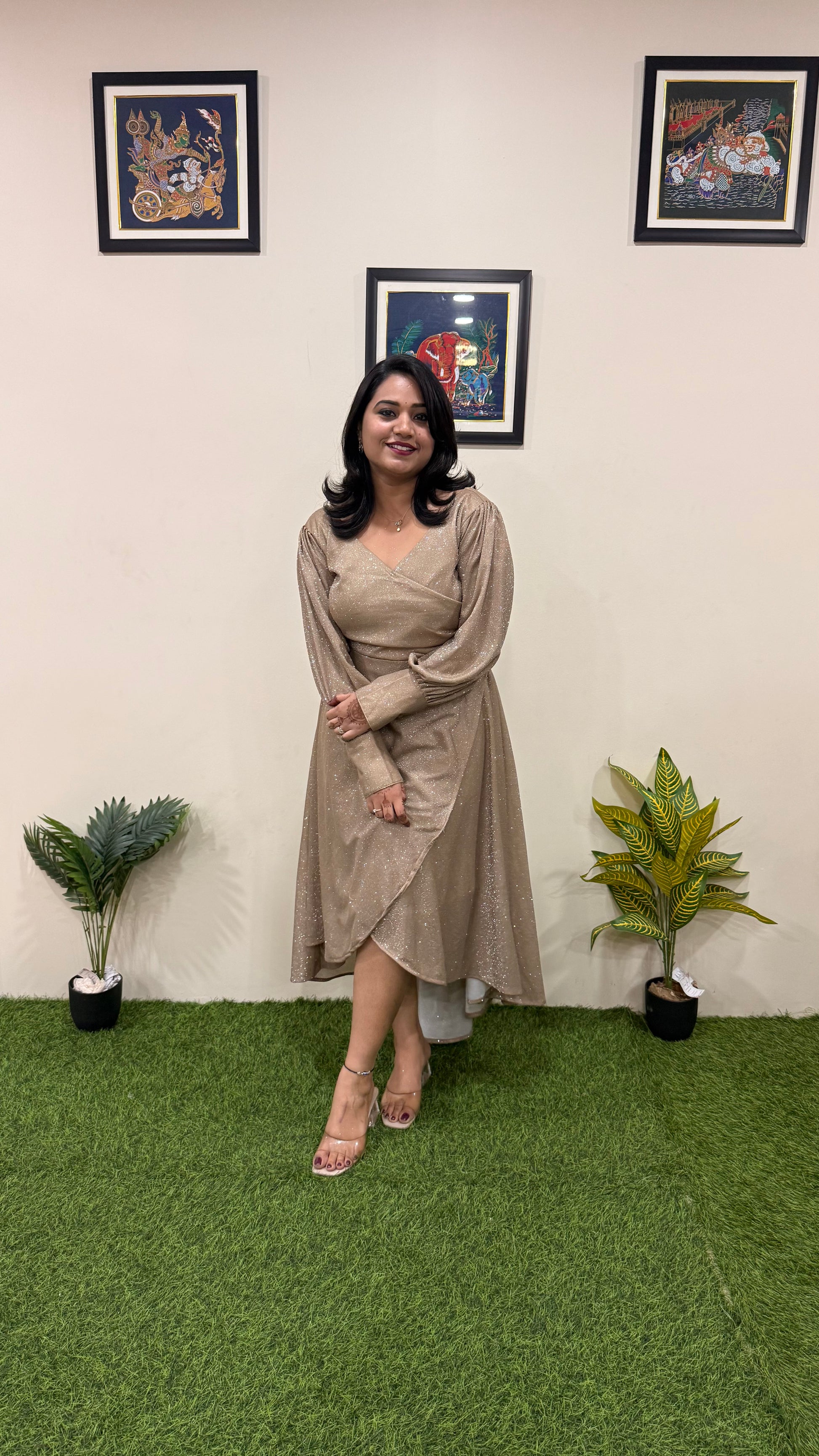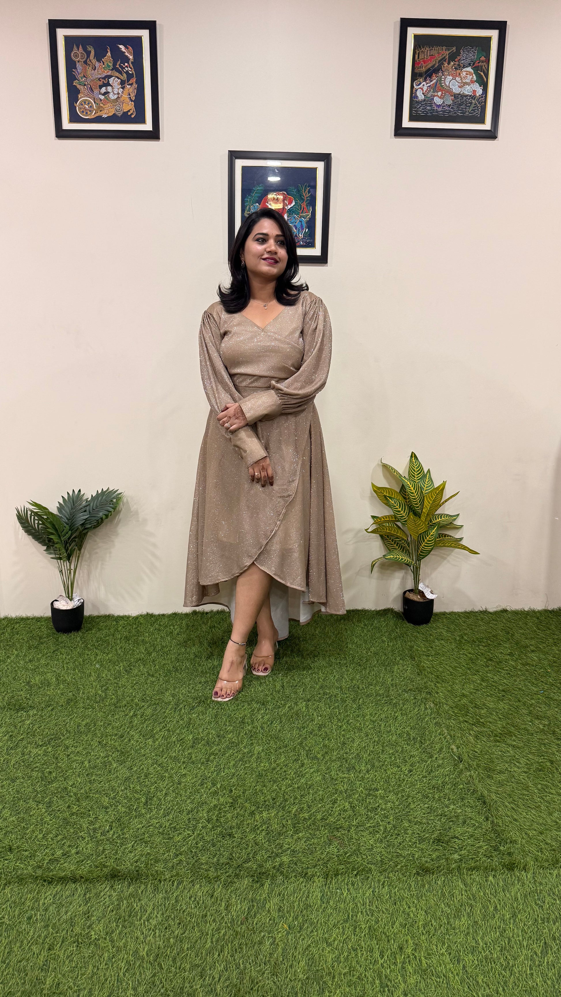 SEO Keywords: shimmer lycra party dress for women, high-low one-piece dress, full sleeve shimmer gown, women’s wedding season evening wear