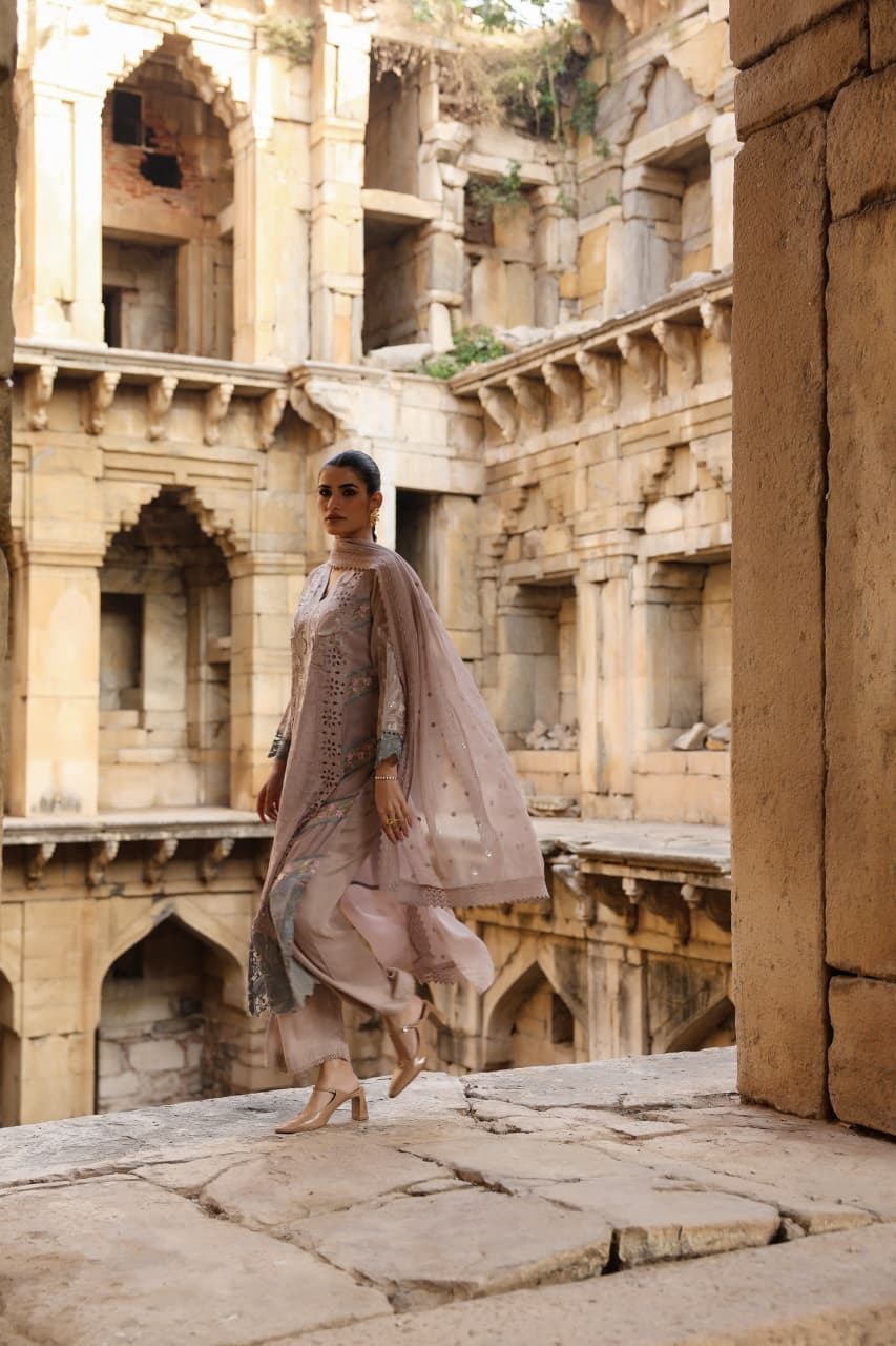 This kurta pant dupatta set for women is crafted using organza fabric, designed with intricate cutwork and lace detailing for a refined ethnic look. The kurta features a structured silhouette with detailed surface work, paired with a coordinated pant and a lightweight matching dupatta that completes the ensemble.