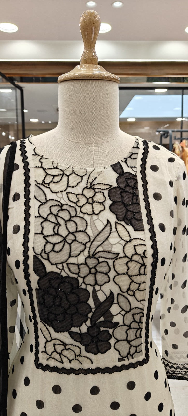 This stitched women’s kurta set is crafted in lightweight printed organza with an inner lining to enhance structure and comfort. The neckline features applique floral motifs with cutdana hand-touch embellishment, complemented by soft sleeves and a coordinated monochrome pattern. The set includes a matching shantoon pant and a striped organza-style dupatta, creating a refined and contemporary ethnic look suitable for semi-formal occasions and day events.