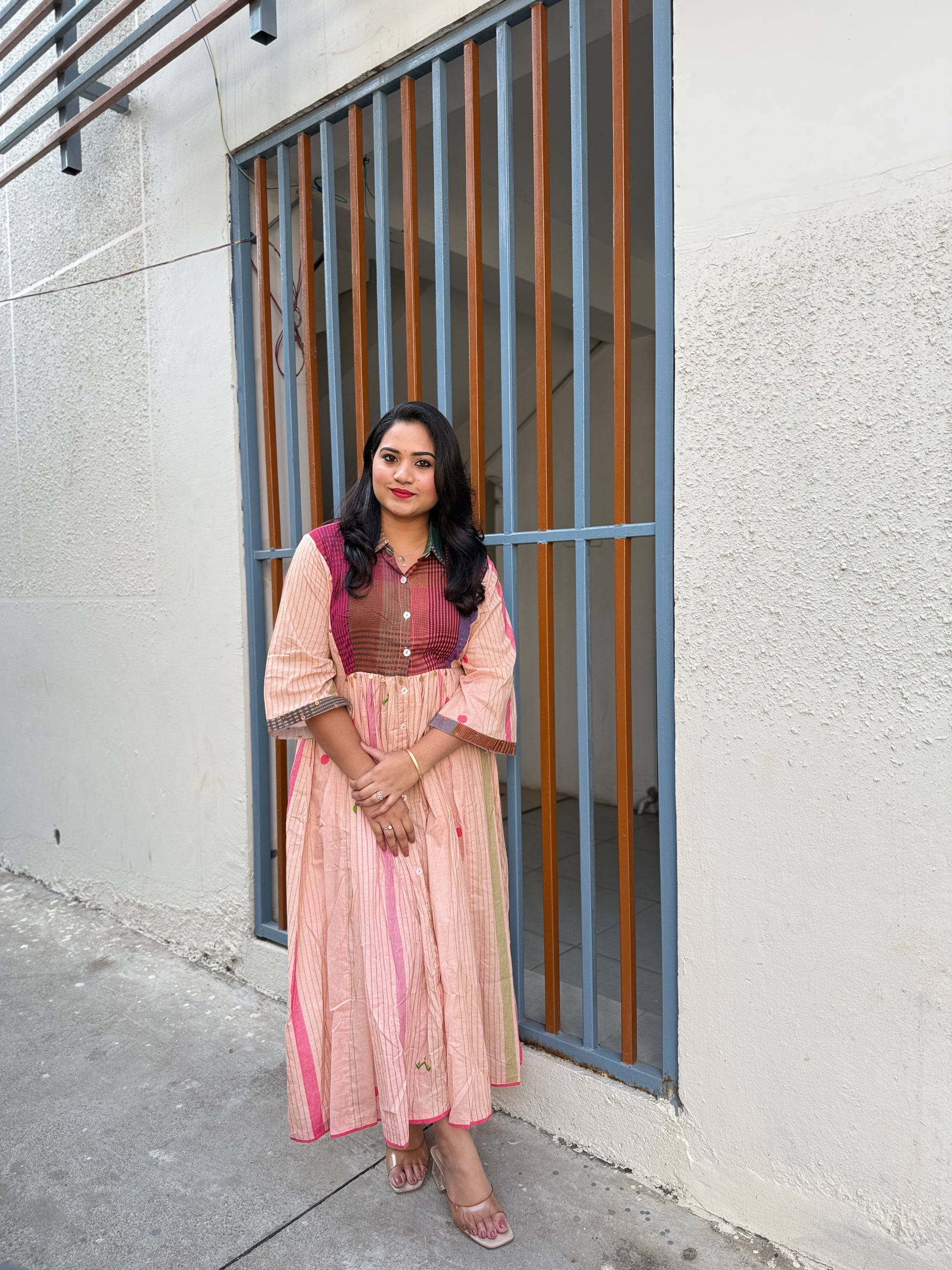 SEO Keywords: pastel cotton dress for women, panelled dress with embroidery, casual ethnic cotton dress, button-down cotton midi dress, women’s artisanal cotton wear