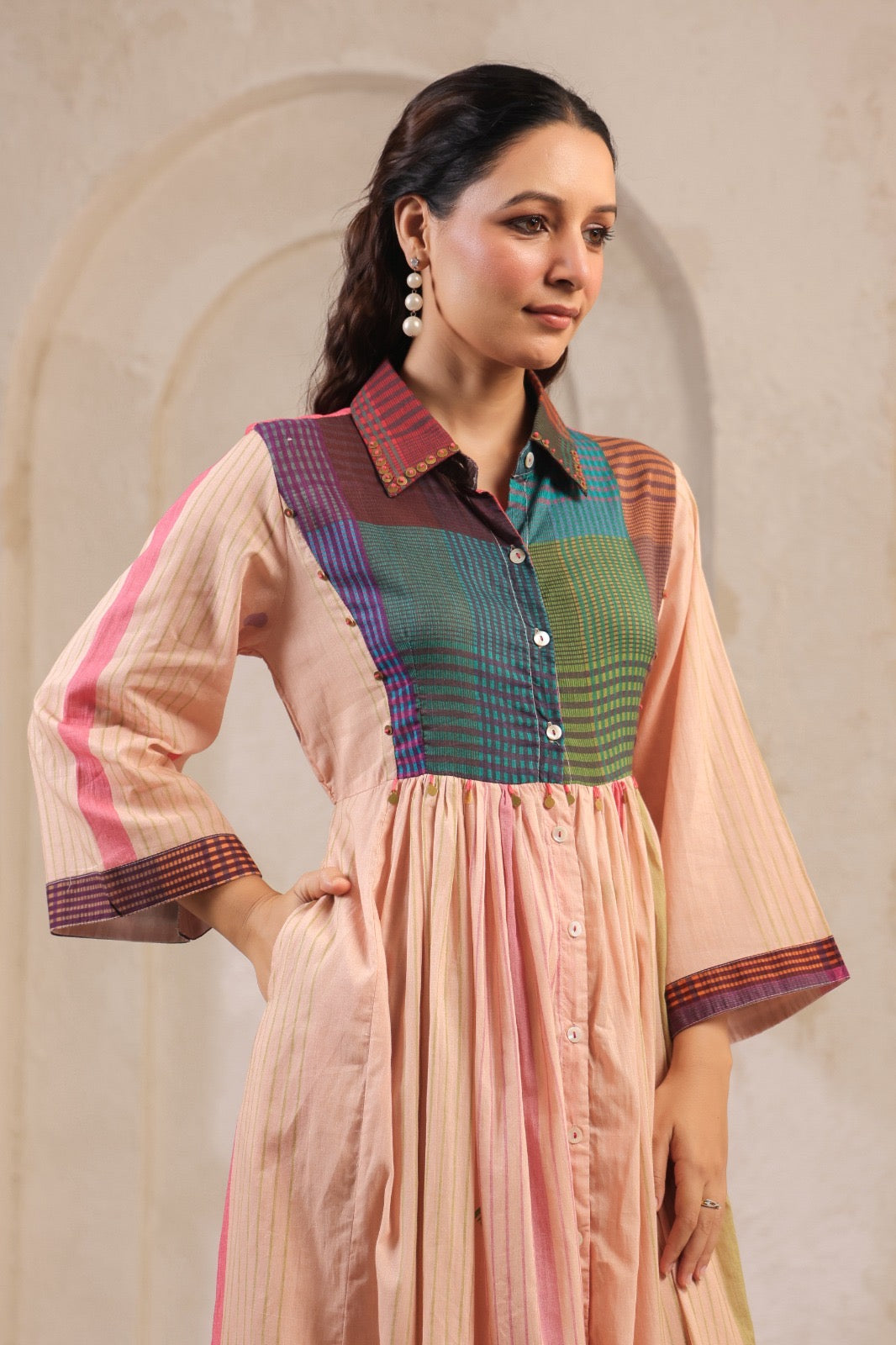 This pastel panelled cotton dress offers a refined balance of artisanal charm and contemporary structure. Crafted from lightweight, breathable cotton, it features a vibrant checkered woven yoke with a button-down placket for versatile styling. The design includes full-length sleeves with contrast cuffs, a softly flared silhouette, and delicate hand-embroidered motifs that add understated elegance. Ideal for casual outings, vacations, and relaxed gatherings, this dress can be styled as both a standalone piece or layered for seasonal versatility. The comfortable fit and airy fabric make it perfect for all-day wear, while the artisanal details ensure a unique aesthetic appeal.