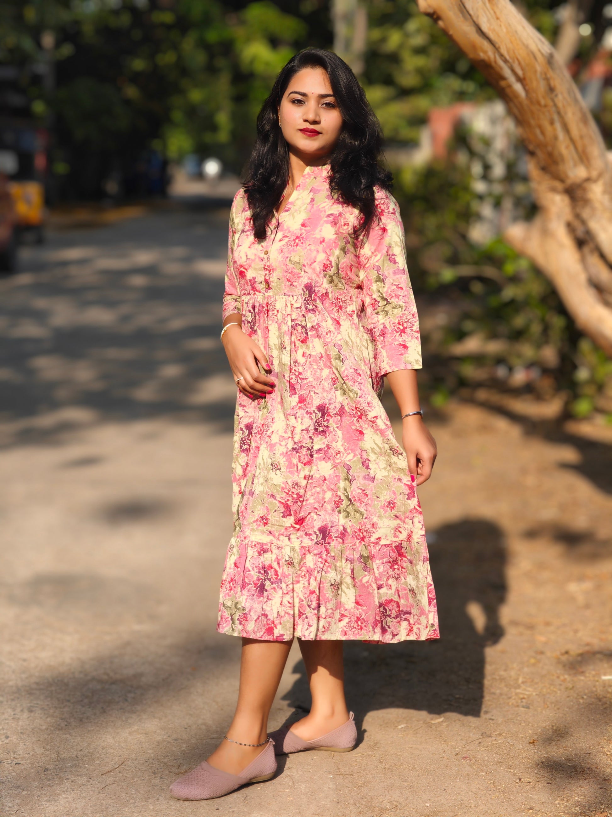 SEO Keywords: Pink cotton abstract print gathered midi dress for women, collared tiered summer dress M to XL