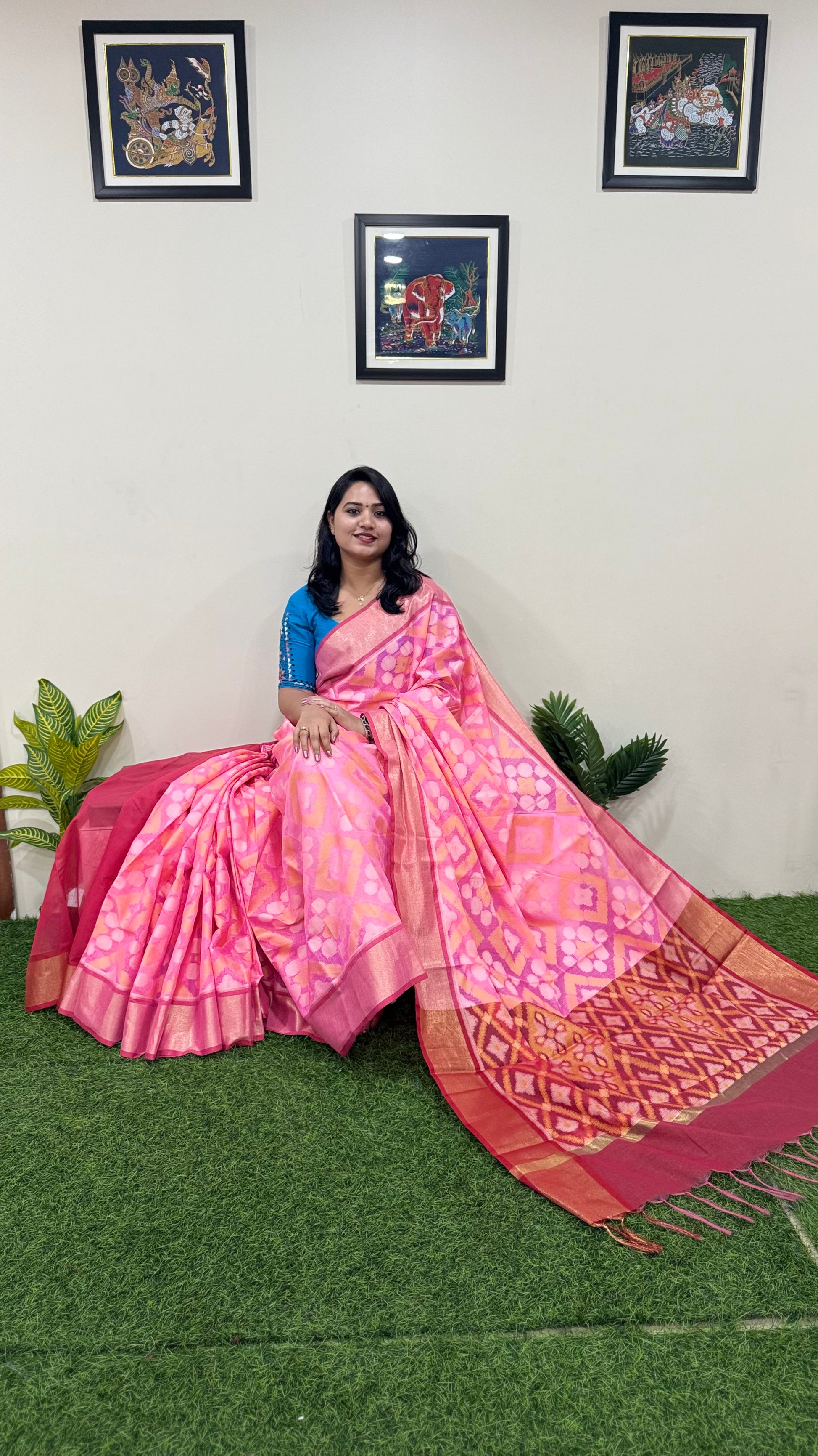 • Design highlight: Woven ikat motifs with contrasting pallu and border