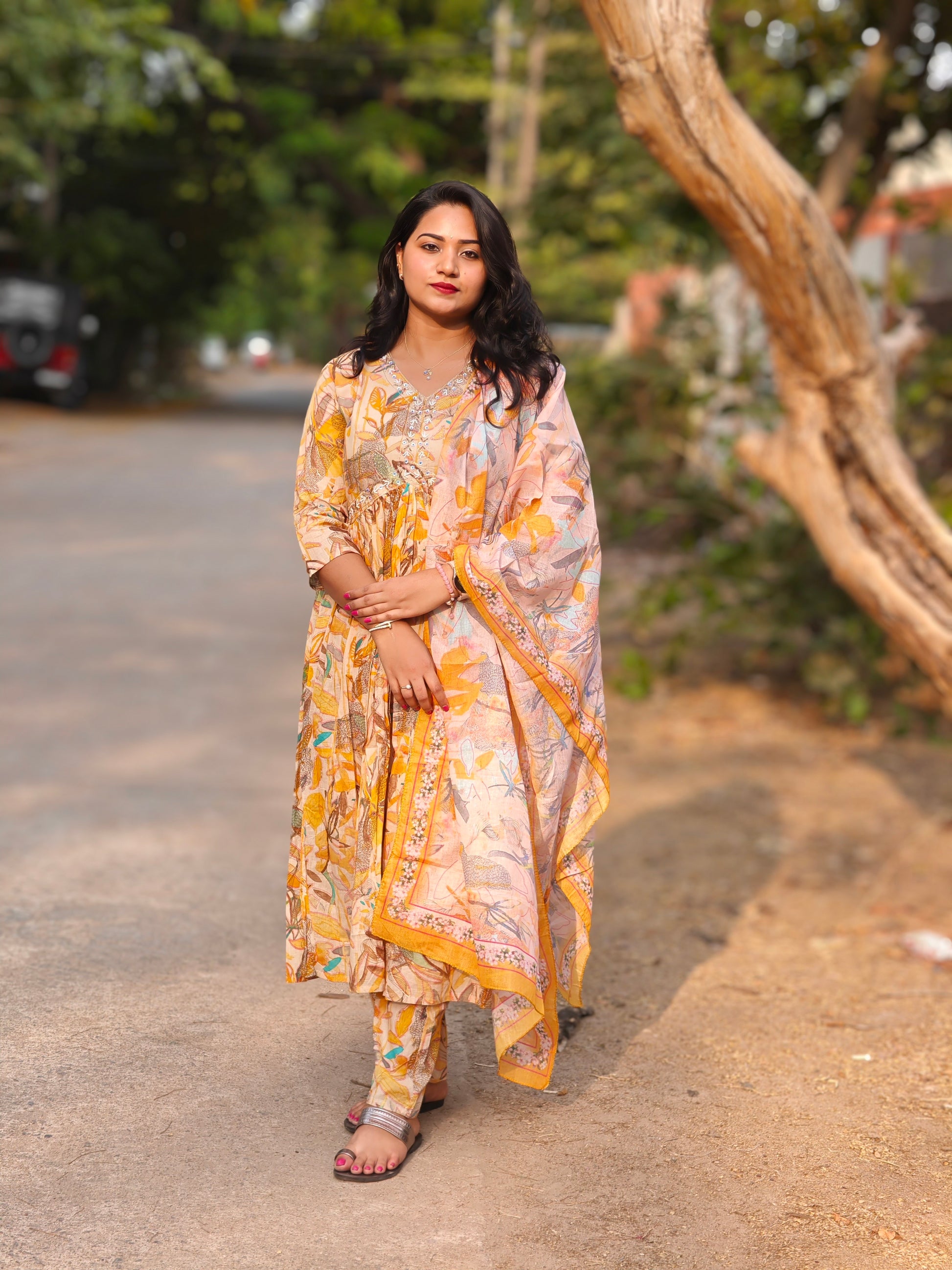 SEO Keywords: yellow alia cut cotton suit set, khatli work festive suit, digital print cotton kurta pant dupatta, cotton alia cut suit 2XL