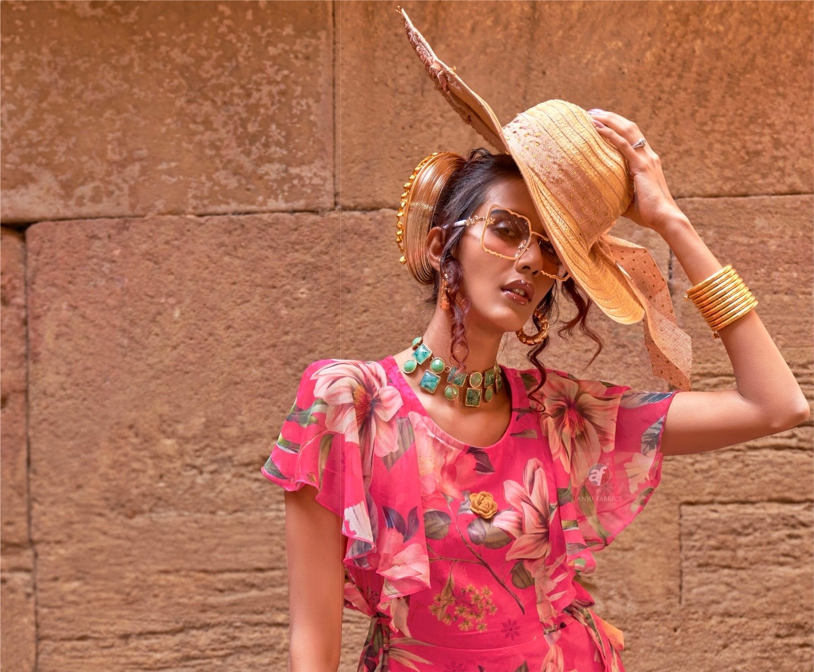 Light, breezy, and effortlessly elegant, this floral one-piece dress is crafted from premium chiffon for a graceful drape and breathable comfort. Designed with flowing silhouettes, it features a delicate floral pattern and comes with a stylish brooch accessory for added charm. Perfect for summer outings, brunch dates, and daytime events, this collection offers six unique designs to suit different style preferences. Available in sizes L to 3XL, it ensures a flattering fit while keeping you cool and chic through the season.
