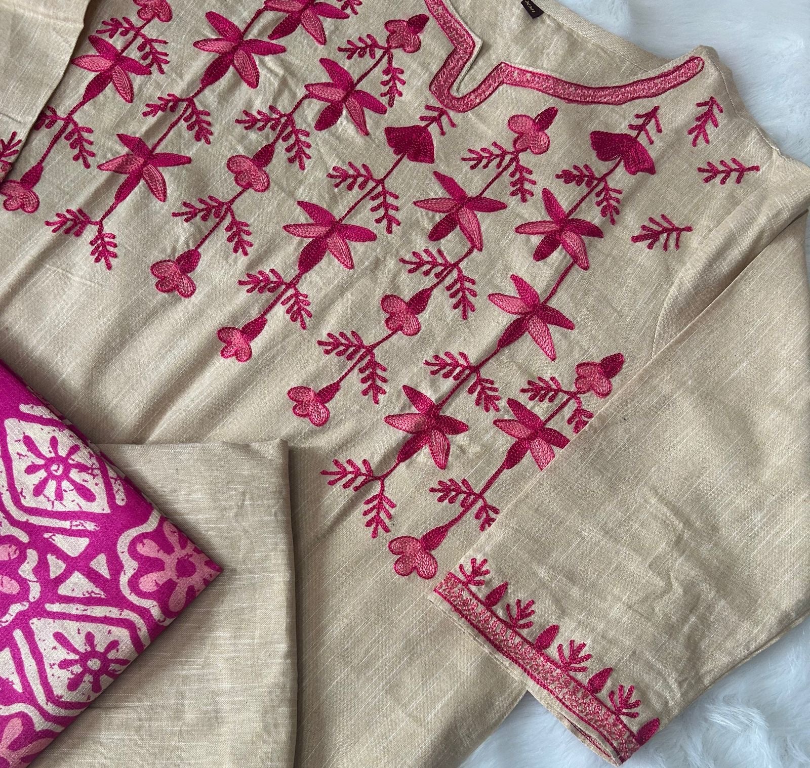 Celebrate timeless tradition with this handloom South cotton kurta pant set paired with a soft silk dupatta. Designed for women who value craftsmanship and cultural elegance, this ensemble beautifully blends intricate embroidery with breathable cotton comfort. The kurta is tailored in a straight-cut silhouette from premium South cotton fabric, offering durability, softness, and ease of wear. Measuring approximately 46–47 inches in length, it provides a graceful fall that flatters most body types. The kurta is embellished with resham thread aari embroidery, a technique admired for its fine, decorative detailing that enhances the garment with an artisanal touch.