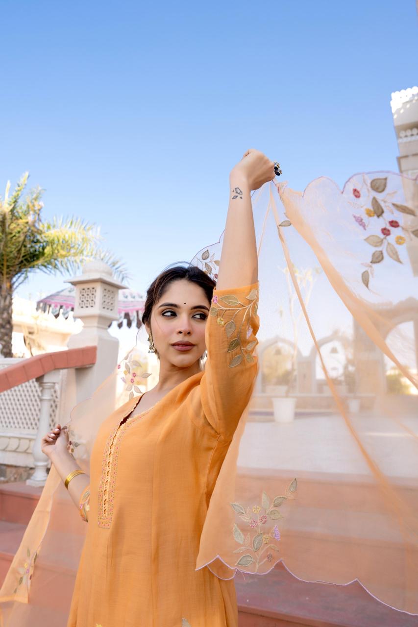 This premium 3-piece Kurta Pant Dupatta Set is crafted from soft and elegant Mul Chanderi fabric, known for its lightweight texture and graceful fall. Designed for women who value both tradition and modern elegance, the set features a beautifully embroidered kurta with delicate handwork detailing, paired with comfortable matching pants and a coordinated dupatta. Ideal for festive wear, celebrations, and refined casual outings, this outfit blends classic craftsmanship with contemporary wearability. The breathable Mul Chanderi fabric ensures comfort throughout the day, while the fine embroidery elevates the look for special occasions. Suitable for women in sizes 38 to 44, this set offers a flattering regular fit that complements a variety of body types.