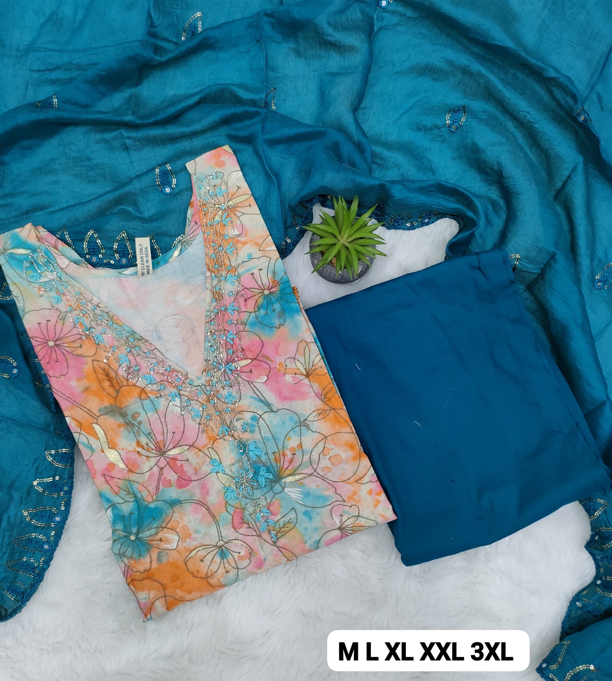 This handcrafted kurti set combines luxurious fabric with intricate detailing for an elegant, festive look. The top is made from premium modal silk with a soft cotton lining for comfort, paired with matching pants for a cohesive style. The highlight of this ensemble is the heavy work dupatta, featuring meticulous craftsmanship that adds richness and sophistication. Each piece is carefully color interlocked to ensure durability and long-lasting vibrancy. Available in sizes M to 3XL, this set is perfect for weddings, festive events, and special celebrations.