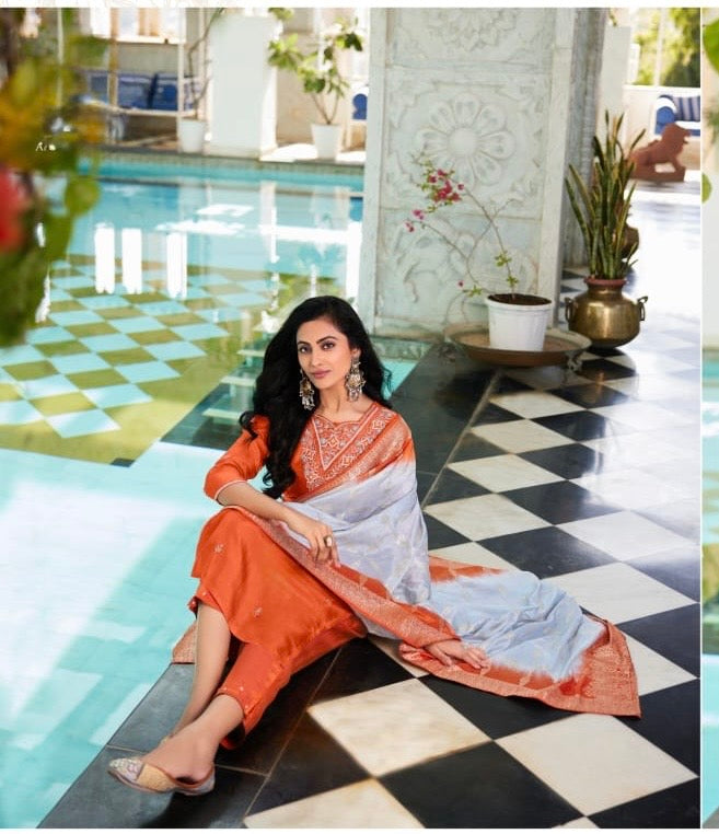 Dola Silk Kurti Set with Russian Silk Pant and Jacquard Dupatta – Handwork Ethnic Set for Women