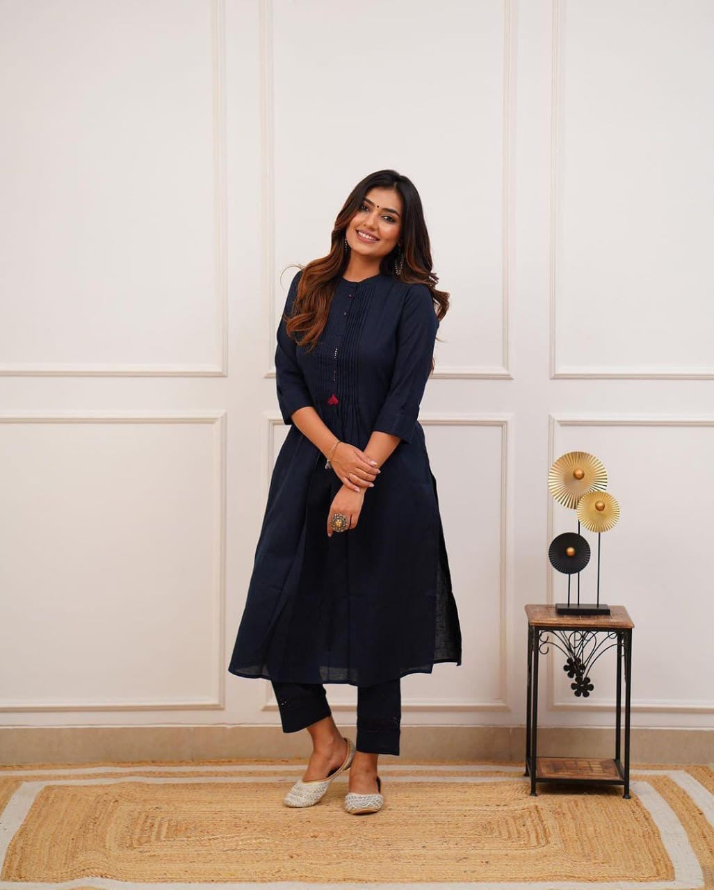 Experience all-day ease and ethnic elegance with this premium rayon sulv kurta set, crafted for comfort and charm. The kurta features a graceful pleated silhouette enhanced with delicate katha work detailing, while the matching rayon sulv pant is finished with subtle crochet lace at the hem. Designed for everyday wear or light festive occasions, this set is available in four rich color options—maroon, blue, pink, and coffee—offering a flattering and breathable fit for women who love traditional textures in a modern avatar.