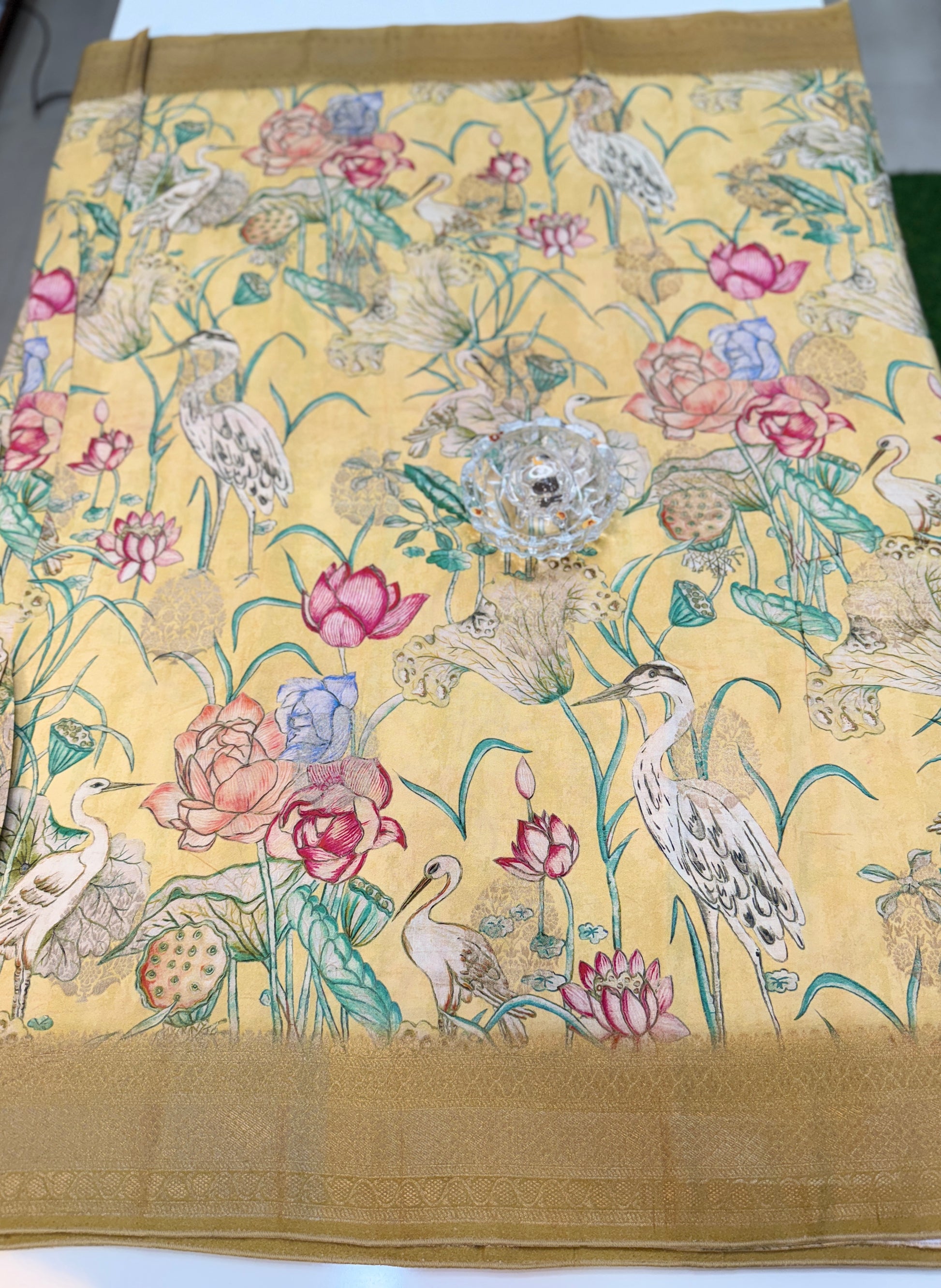 • Design: Digital prints with zari border and woven pallu