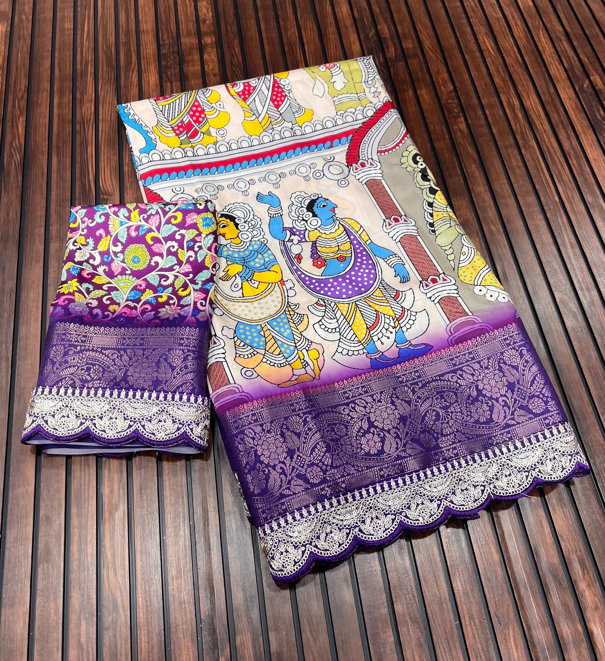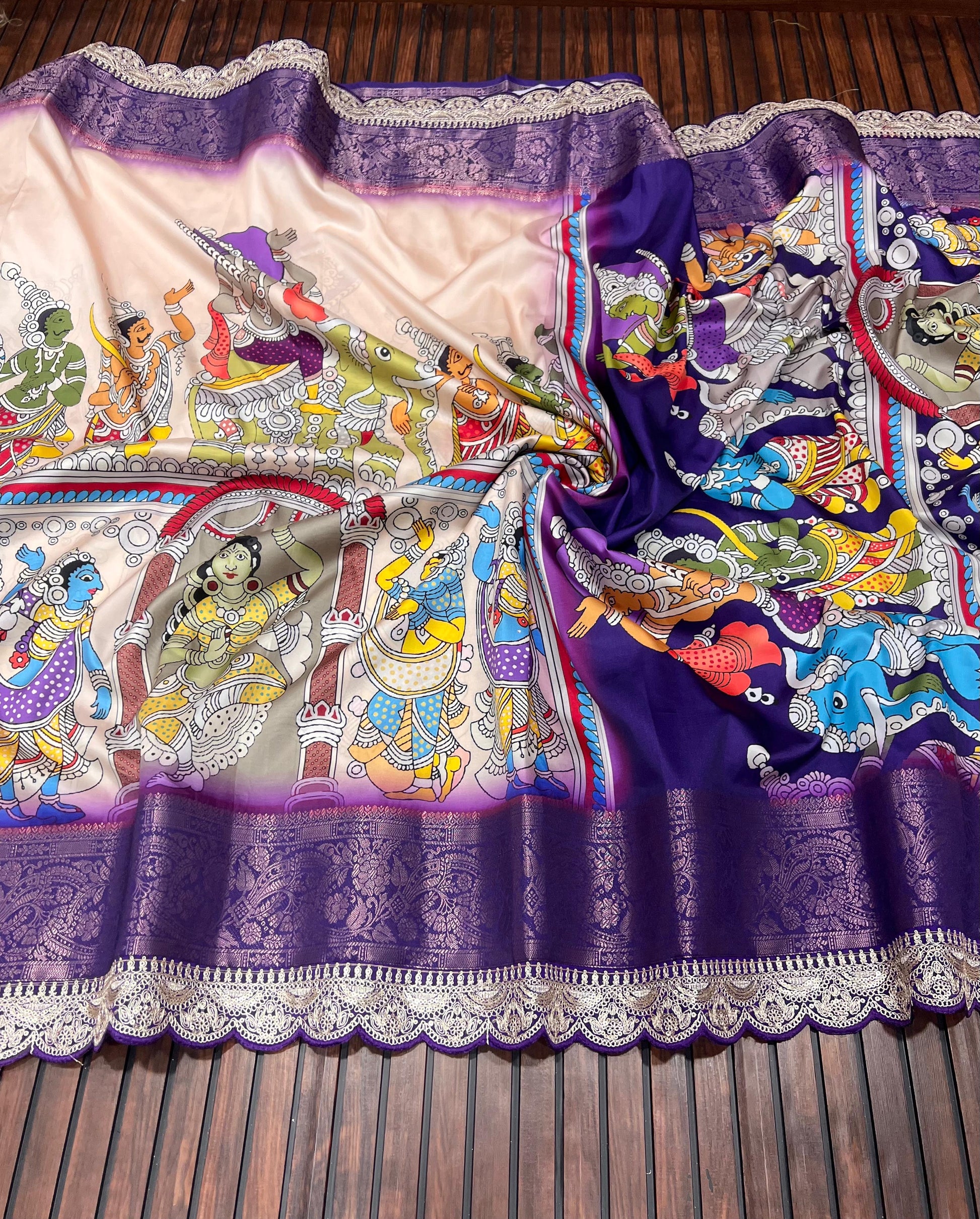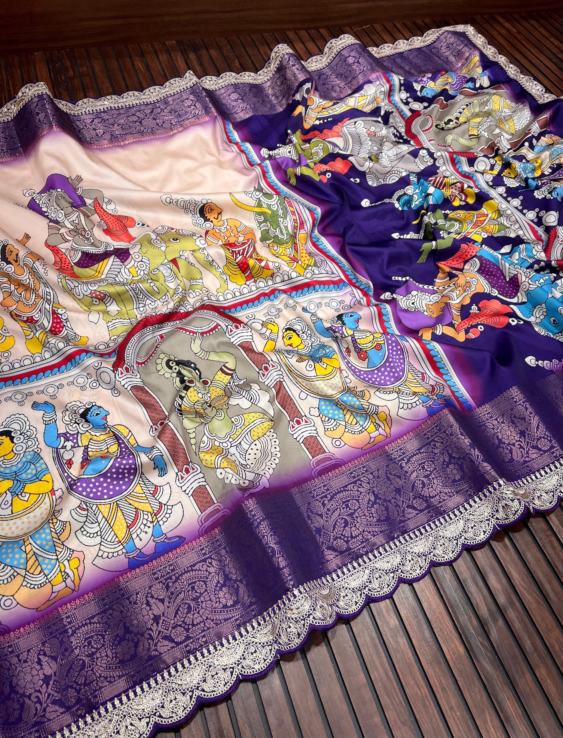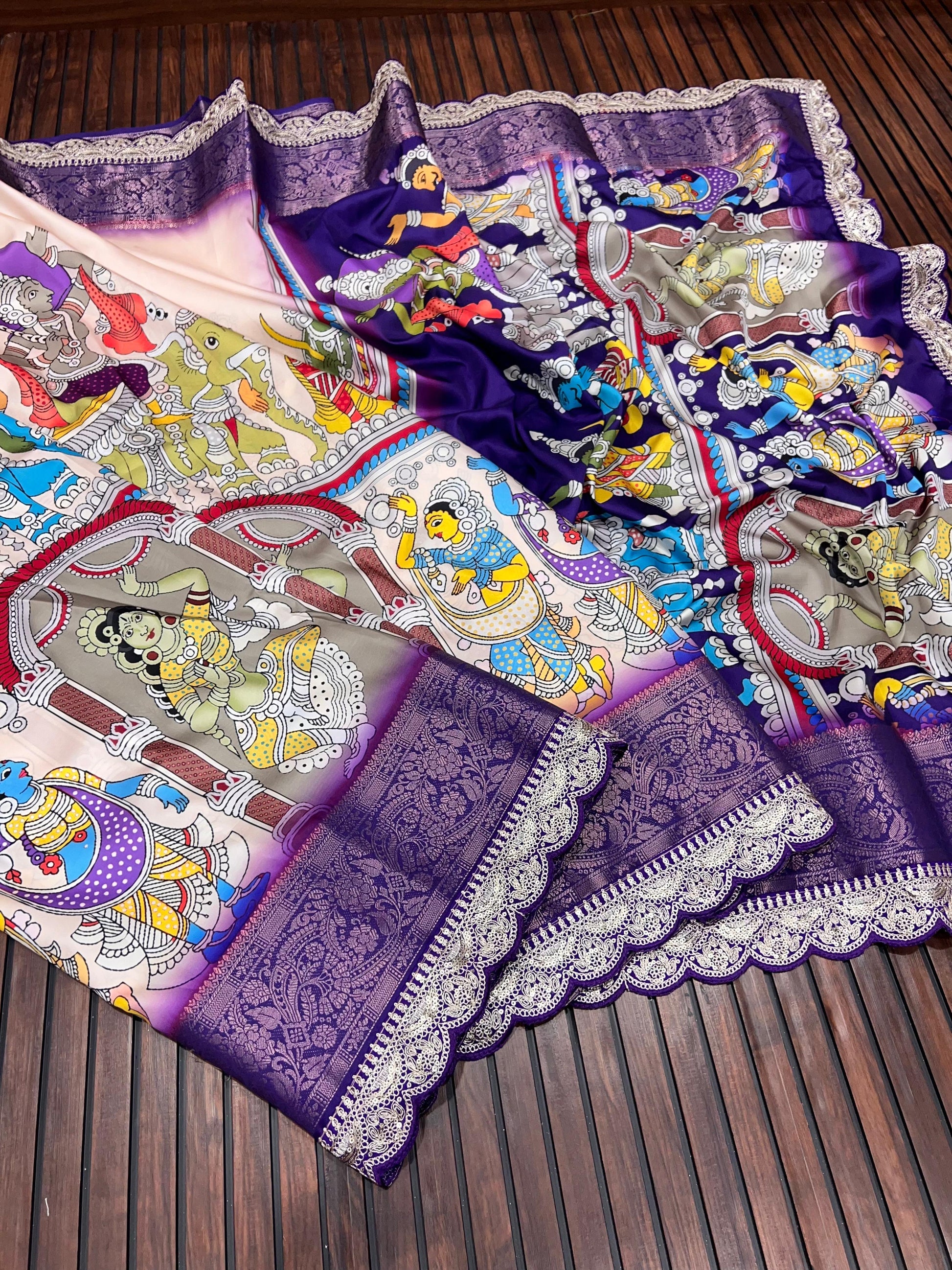 Work: HD digital Pichwai Kalamkari print with heavy coding sequins embroidery lace border