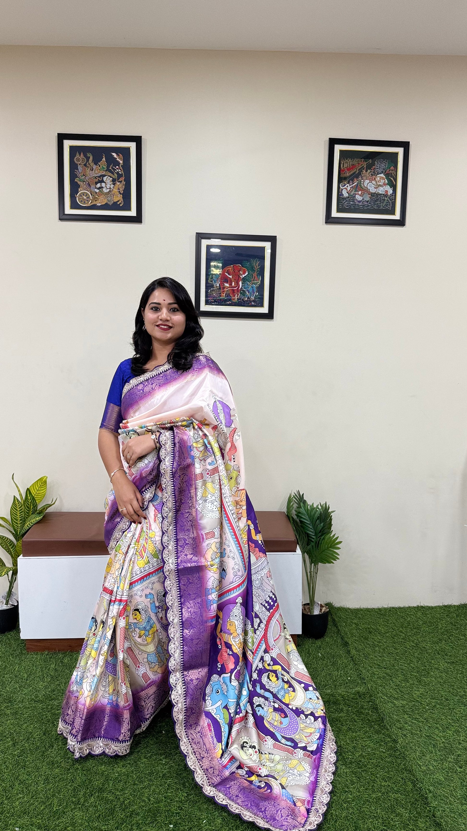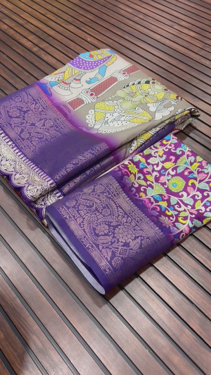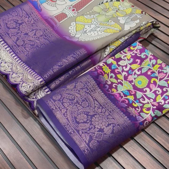 Its body is enhanced with HD digital Pichwai Kalamkari prints, bringing cultural artistry to life with vibrant detailing. The designer lace border with heavy coding sequins embroidery adds a subtle shimmer, making the saree a refined choice for weddings, festive gatherings, and special occasions.