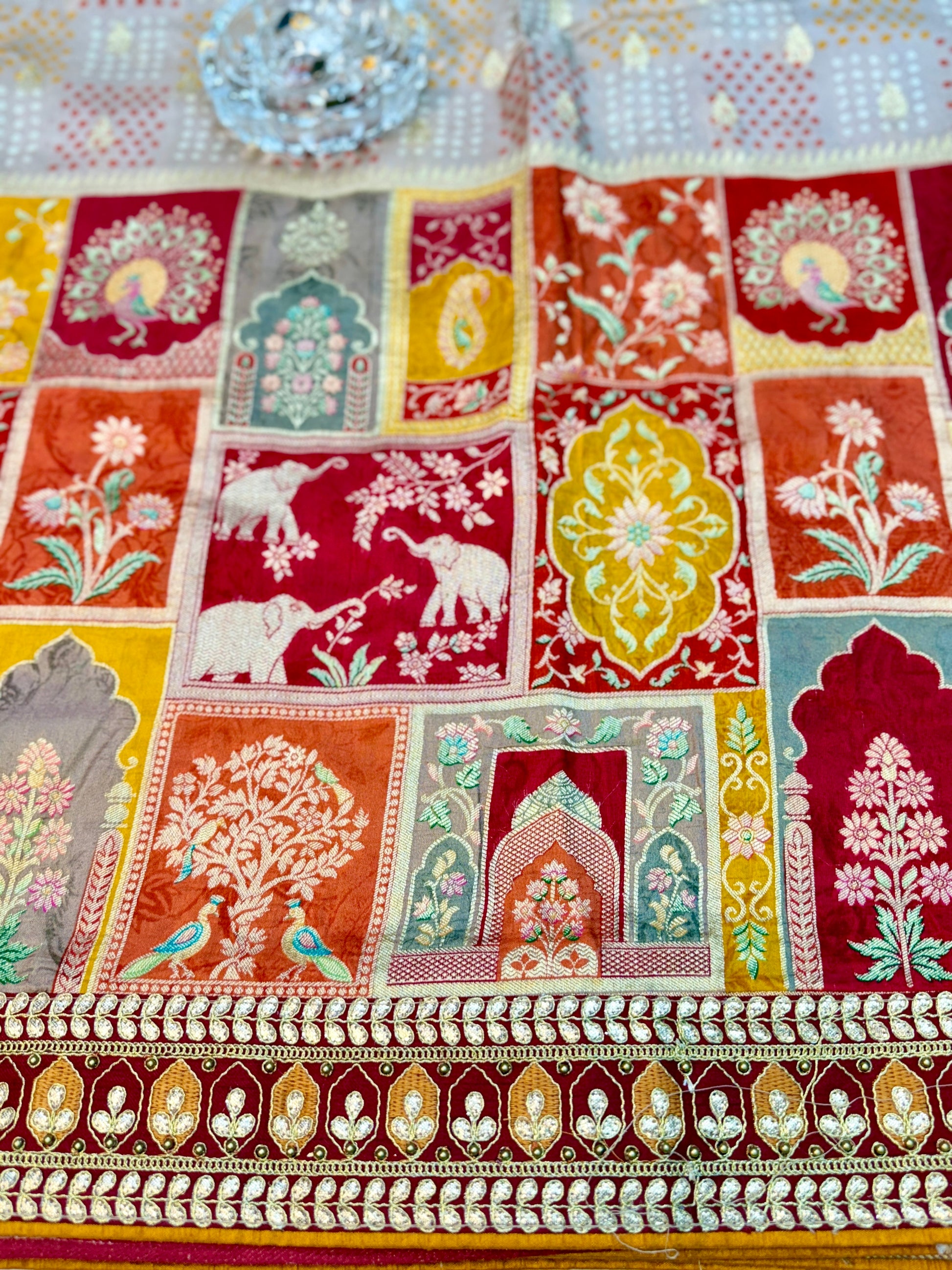 Design: Traditional weaving paired with a richly embellished blouse